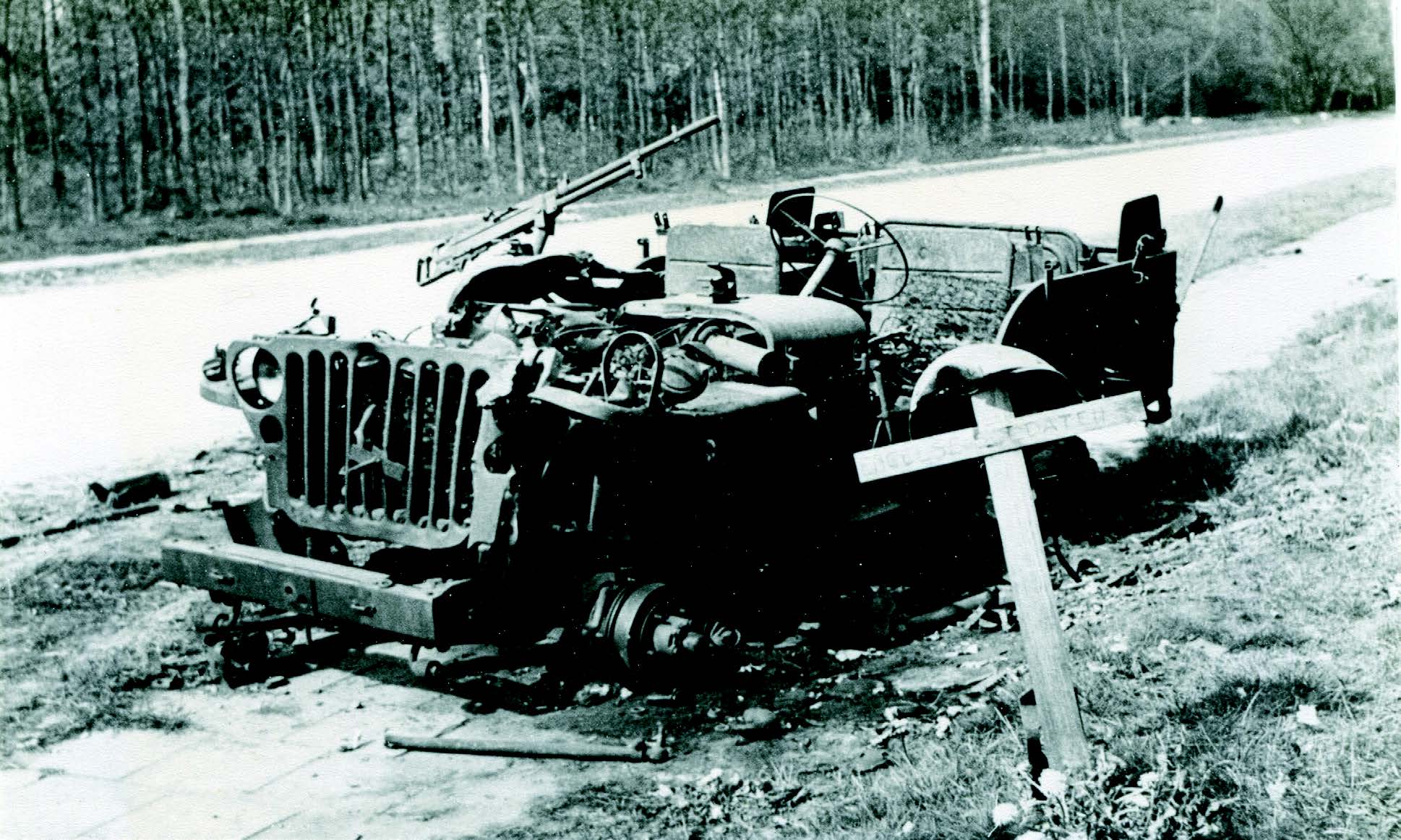 Lance-Sergeant William ‘Bill’ Bentall in een jeep van ‘D’ Troop, 1st Airborne Reconnaissance Squadron, met de Nederlandse burgers H. Piek en B. Versteegh, aan het westelijke einde van de Backerstraat in Oosterbeek (copyright foto: D. van Woerkom)