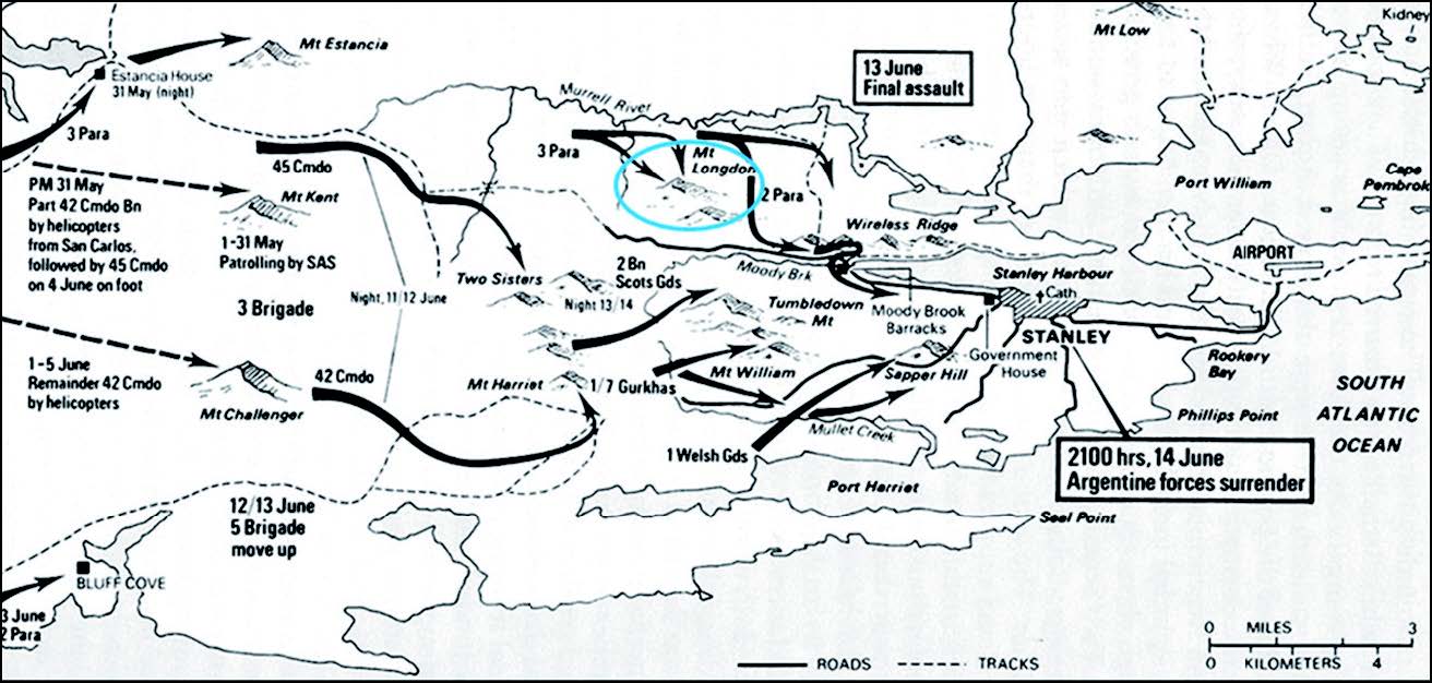 Op 11 juni startte 3 Para na het invallen van de duister-nis met de naderingsmars tot de startlijn tien kilometer verderop. Het uur U was 20.00u. Pike had besloten tot een stille nachtaanval en zag af van inleidende be-schietingen door de artillerie. Terwijl B Company in verspreide formatie voorzichtig voorwaarts ging over de startlijn, stapte één van de soldaten op een mijn.