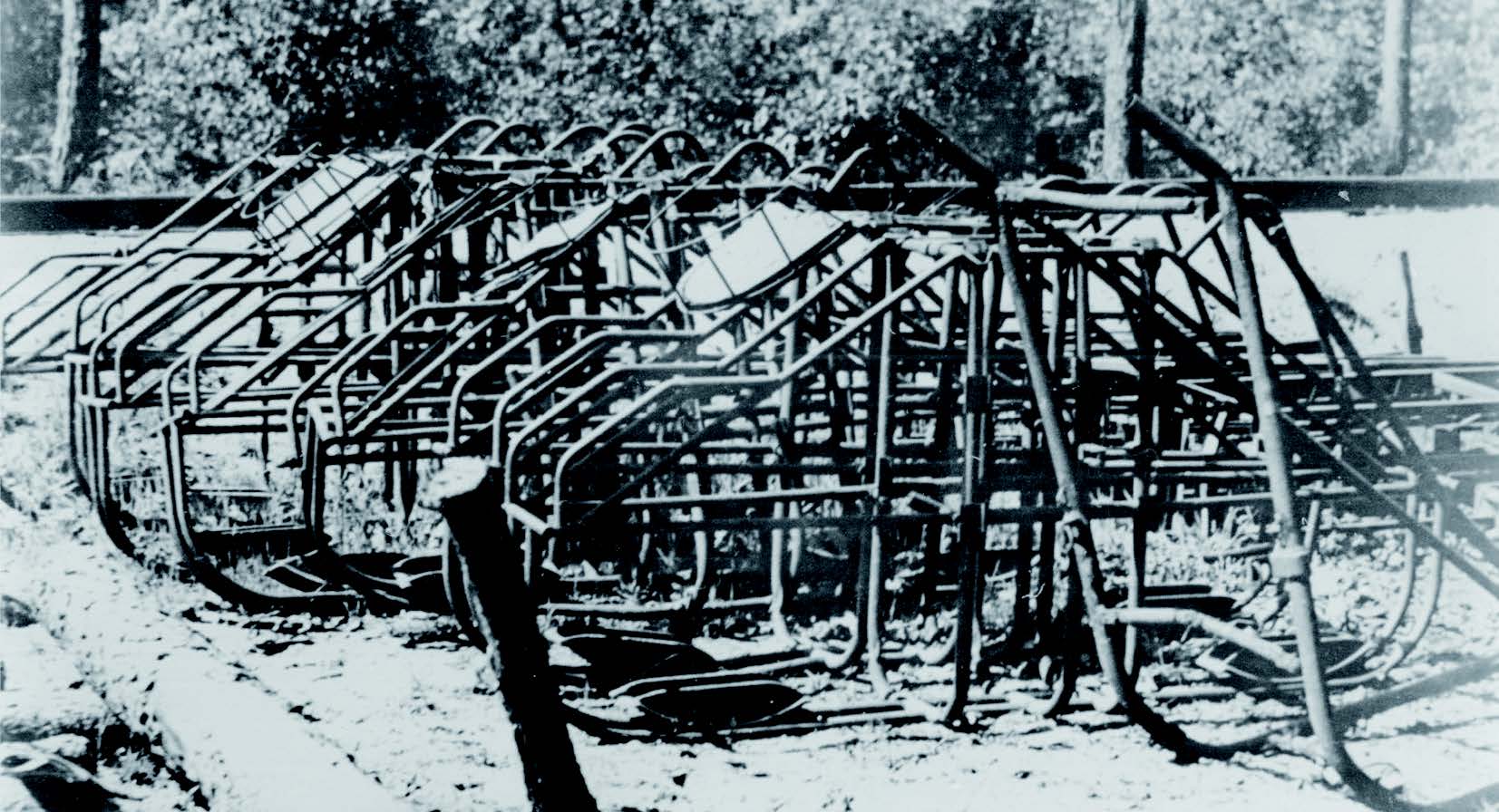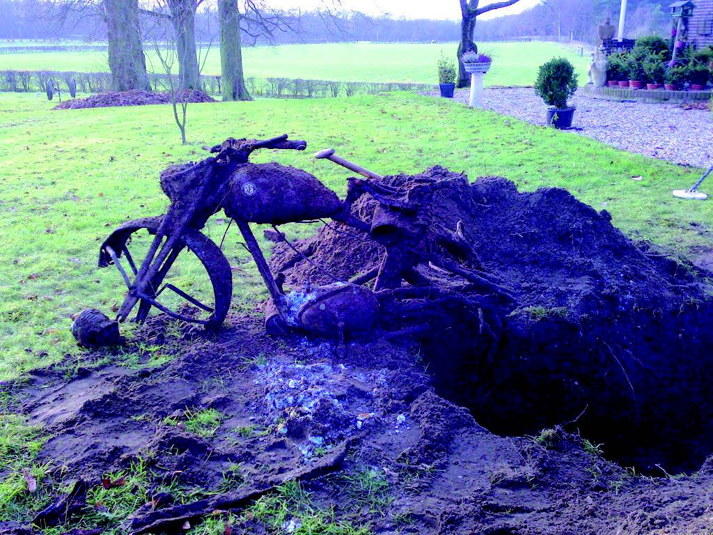 Royal Enfield ‘Flying Flea’-motorfietsen werden gedropt. Bij het opruimen van de landingsterreinen bij Wolf-heze, na de bevrijding in 1945, werden deze frames samen met allerlei onderdelen van gliders, containers en ander achtergelaten materiaal opgeslagen langs de Wolfhezerweg. Achter de frames is het lage dijkje van de spoorlijn naar het vliegveld Deelen zichtbaar. De fotograaf had kennelijk weinig verstand van dit soort materiaal. Hij noteerde bij deze foto: “Achtergelaten stoelen van zweefvliegtuigen” (foto: via Robert Voskuil).