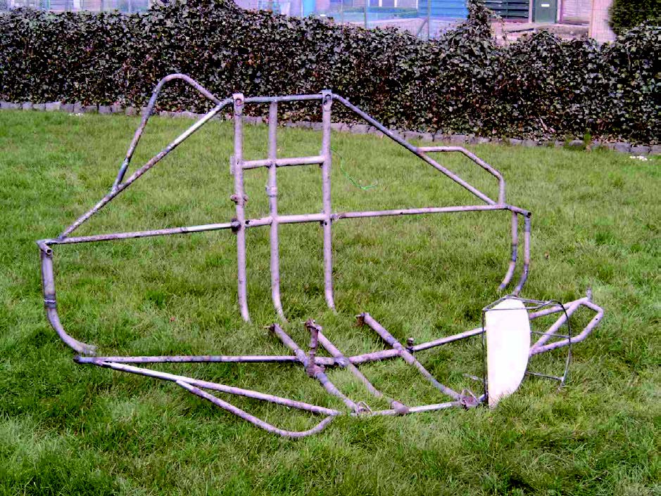 Royal Enfield met dropkooi in de Glider Collection in Wofheze (foto: Leo van Midden). De ijzeren kooi waarin de motorfietsen konden worden gedropt, bestond uit een stelsel van buizen en werd ook door de Royal Enfieldfabriek gemaakt. Dit zogenaamde ‘crash proof’-frame bleek in de praktijk echter niet altijd crash proof.