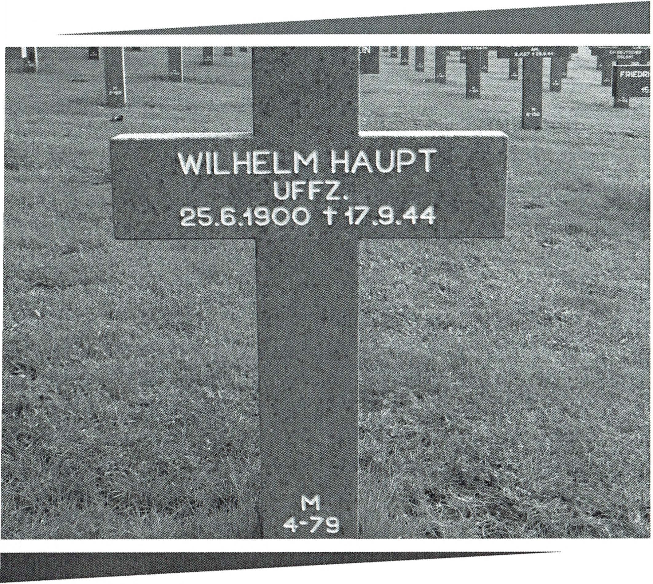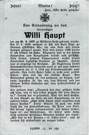 “Unteroffizier Willi Haupt was born on 25. 06. 1900 in Mülheim-Ruhr. On the 17September 1932 he was married to Anni Bogt and they were blessed by God with a boy. Since the year 1939 he has served as a soldier in the field. He was loved and valued by his comrades as well as his superiors. His comrades knew him with his merry and cheerful temperament during happy times. Finally he was put to action at Arnhem. On the 17th September 1944 [his wedding anniversary] he and two other comrades accompanied his commanding general on a reconnaissance. He would not return from his trip. Here he was hit by a deadly bullet. His comrades succeeded in recovering his body and then buried him, together with the general and both the other soldiers at the military cemetery at Arnhem.”