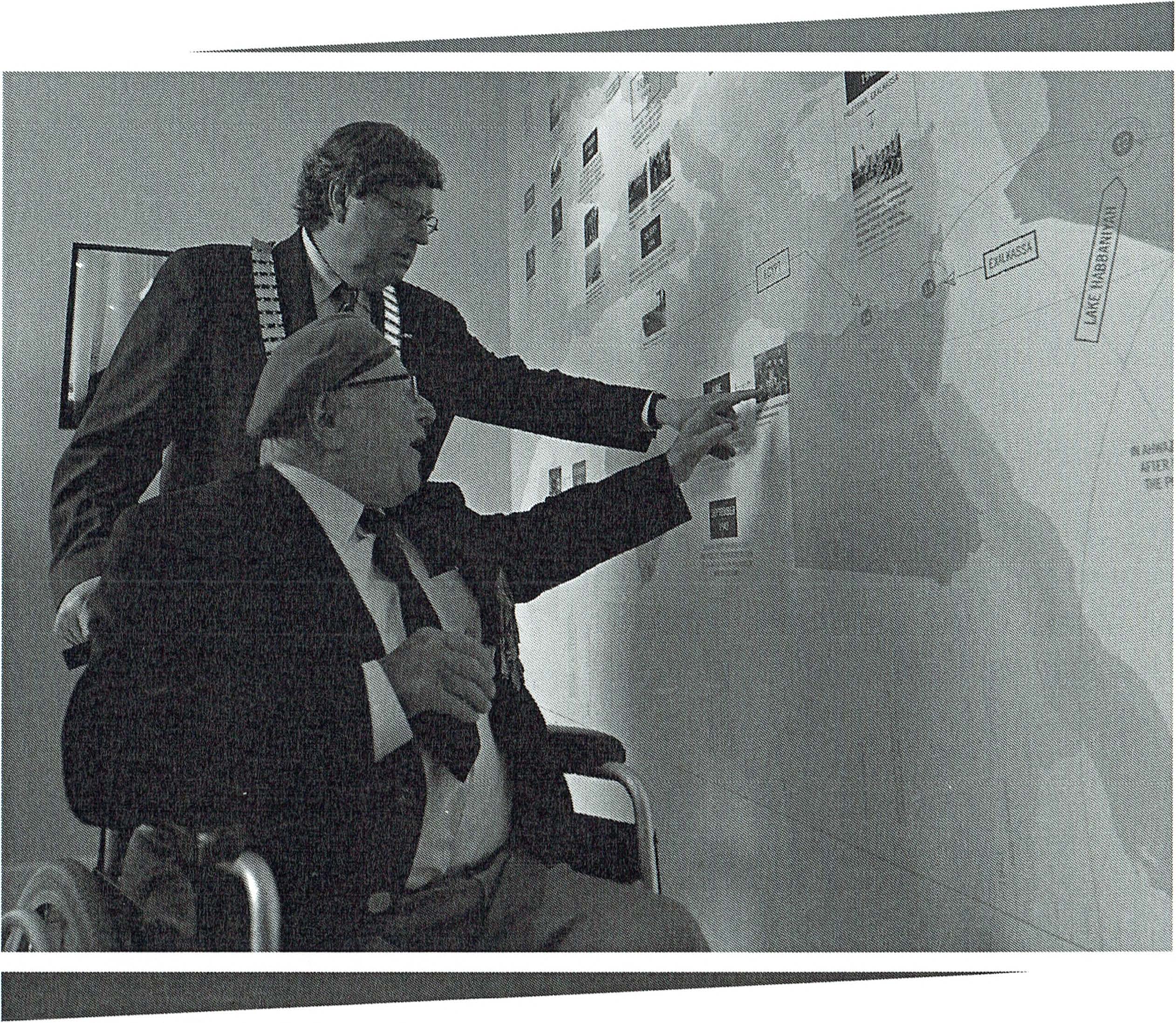 Sitting in a wheelchair, that is pushed by the Acting Mayor of Renkum, Hein Bloemen, the 93year old Polish veteran Jozef Wojciechowski looks at the exhibition about his life (Photo: berrydereusfotografie.nl)