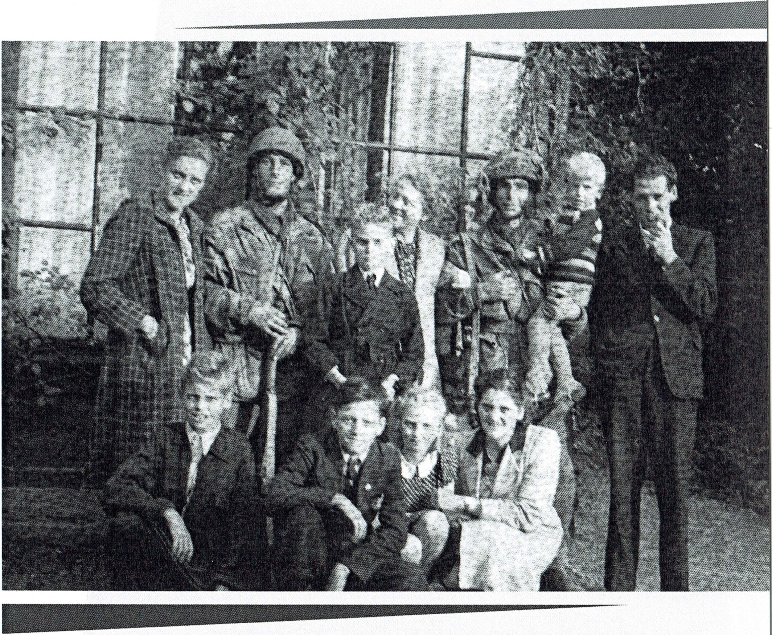 This photo was taken by Mr Kremer on 21 September 1944, with the camera of his wife, Mrs Kremer-Kingma. There was a short cease-fire, during which it was possible to take a group photo at the conservatory of the house at No.8 Stationsweg in Oosterbeek. Those in the photo are: standing from left to right: Mrs E.M. Hardeman-Schikker (taken in as a refugee in the family Kremer house], Sergeant David Shipp (D Squadron Glider Pilot Regiment), Sander Kremer and their mother, Mrs A.L.A. Kremer-Kingma, Sergeant Norman Williams) D Squadron Glider Pilot Regiment) with Max Hardeman on the arm and Mr A van Schelven (hideaway with Mrs Hardeman).