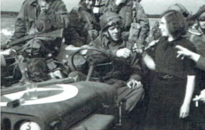 Gerdina Pennings gives a glass of water to the driver of a jeep, who stopped on the road in front of the farm. IPhoto: Sgt Mike Lewis IAFPU] – Collection: Imperial War Museum London.
