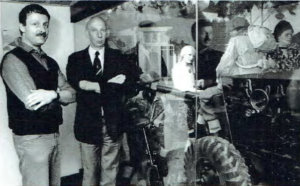 One photo from the 1980 years in the last century. Berry de Reus and Director Caret Wilhelm pose in the basement of the Museum near the Inow no longer existing] large diorama of the British troops entering Oosterbeek. [Photo collection of Berry de Reus)