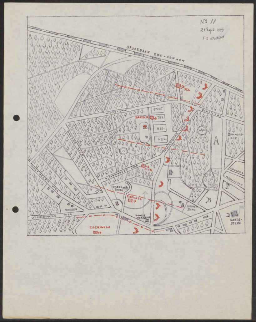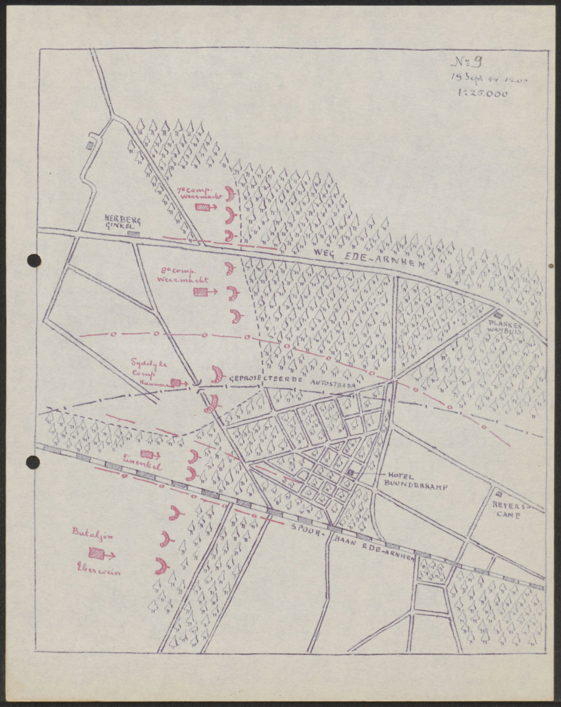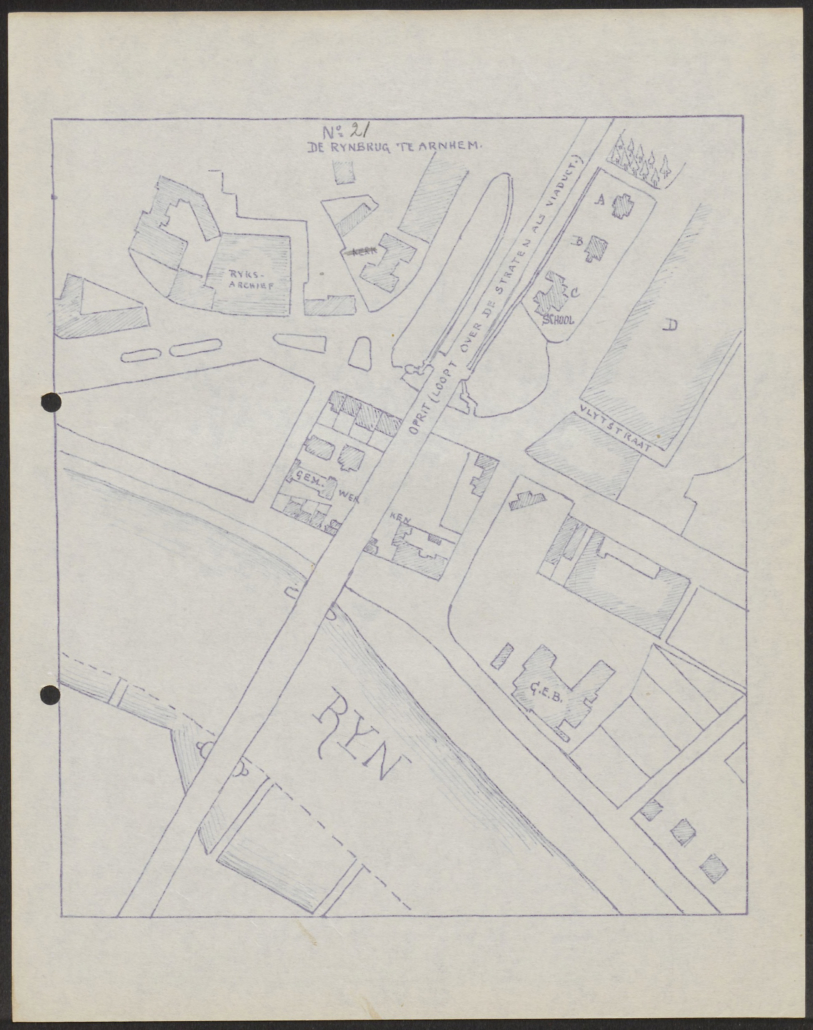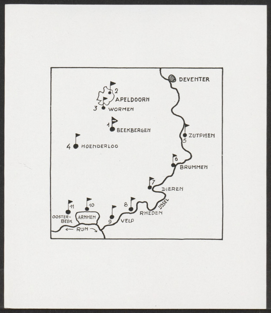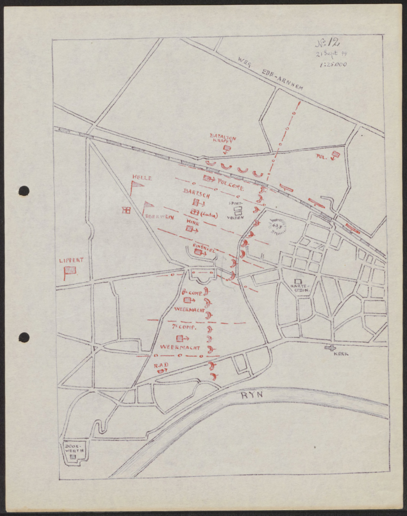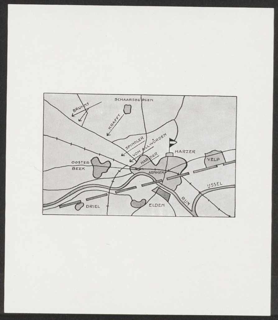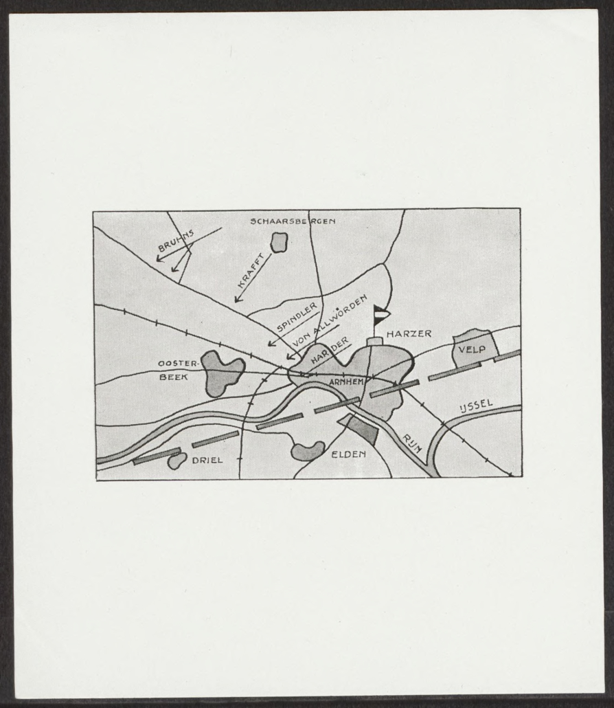 N.B. Kopieën van 23 door Boeree eigenhandige gemaakte kaarten (kwarto-formaat) waarop de troepenbewegingen en posities tijdens de belangrijkste fasen van de Slag om Arnhem zijn ingetekend. Een aantal van de hier beschreven schetsen heeft gediend als basismateriaal voor de grotere formaten die Boeree maakte met het oog op lezingen (zie nr. 52) en voor de calques met bijbehorende lichtdrukken die door de Arnhemse Dienst van Gemeentewerken zijn vervaardigd (zie nr. 53). Vgl. ook de nrs. 3c en 3e van dit overzicht.Kaarten van Boeree