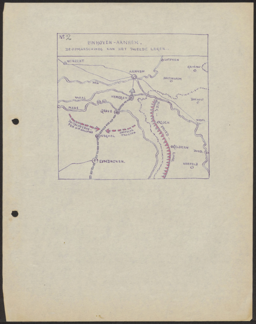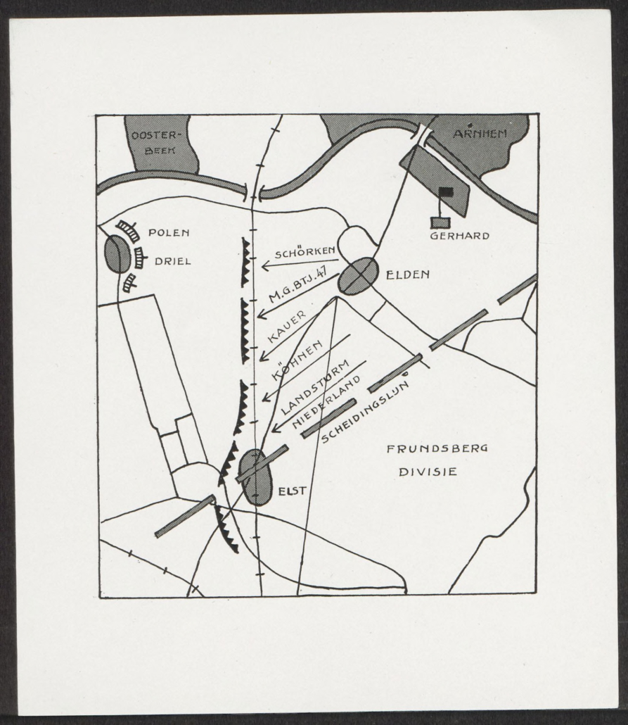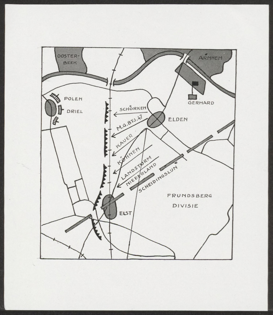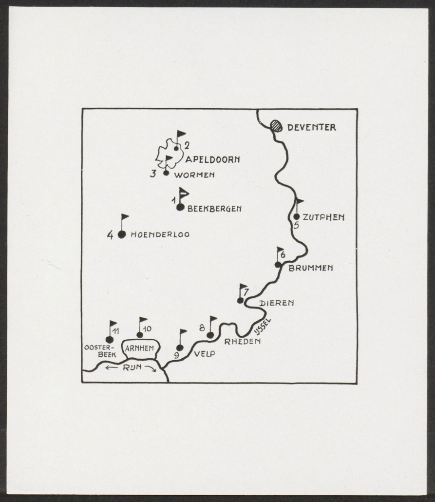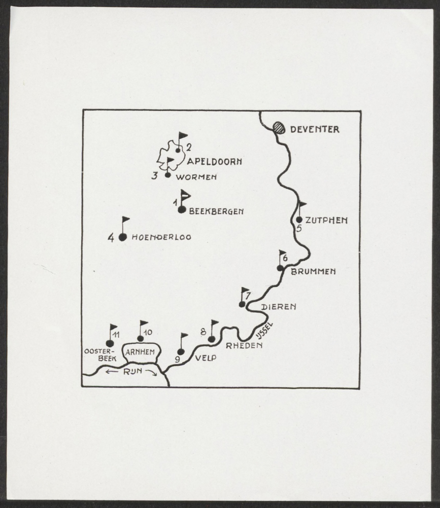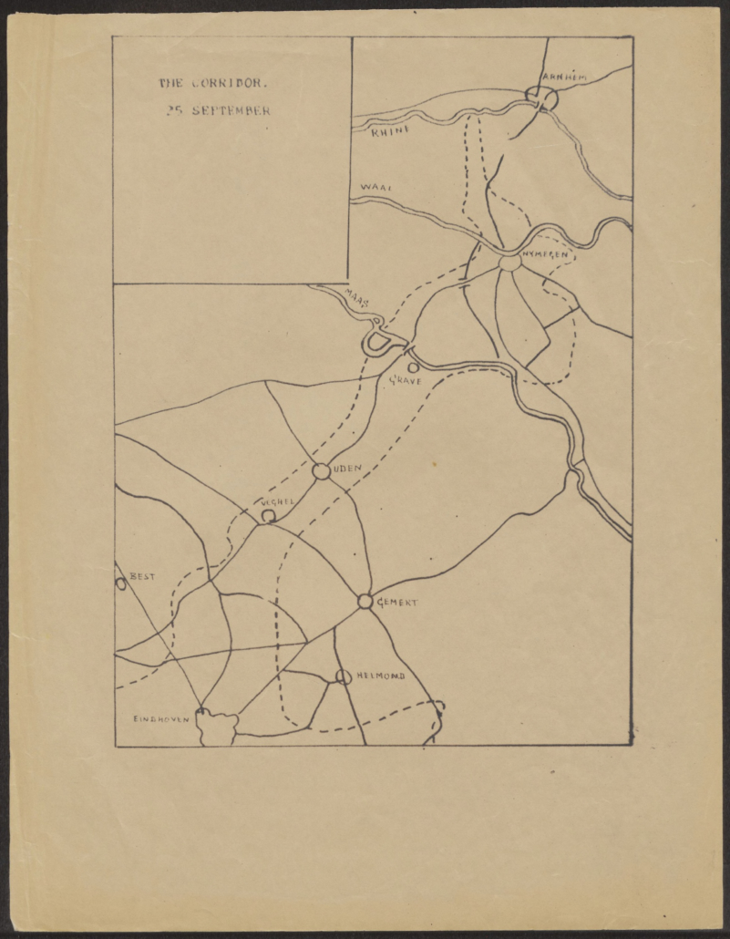 N.B. Kopieën van 23 door Boeree eigenhandige gemaakte kaarten (kwarto-formaat) waarop de troepenbewegingen en posities tijdens de belangrijkste fasen van de Slag om Arnhem zijn ingetekend. Een aantal van de hier beschreven schetsen heeft gediend als basismateriaal voor de grotere formaten die Boeree maakte met het oog op lezingen (zie nr. 52) en voor de calques met bijbehorende lichtdrukken die door de Arnhemse Dienst van Gemeentewerken zijn vervaardigd (zie nr. 53). Vgl. ook de nrs. 3c en 3e van dit overzicht.Kaarten van Boeree