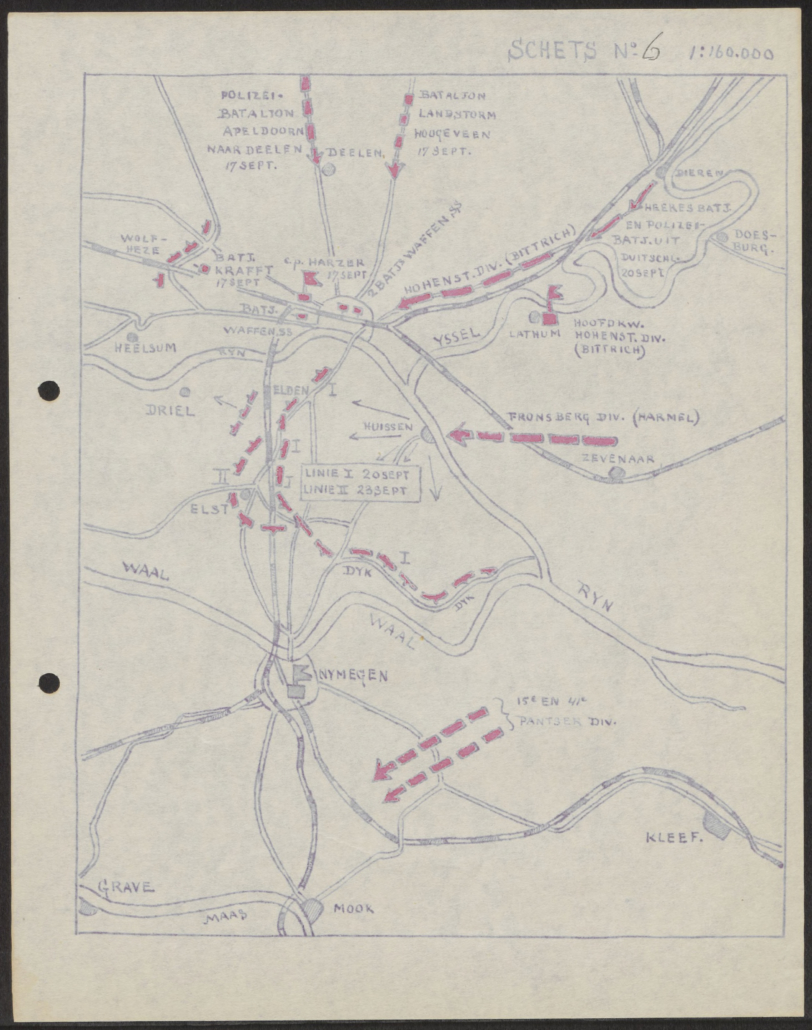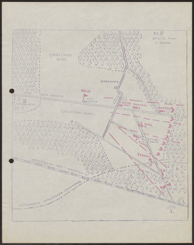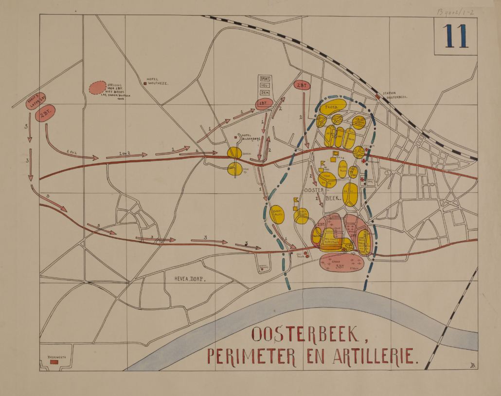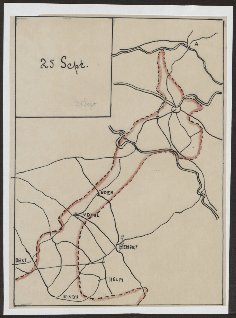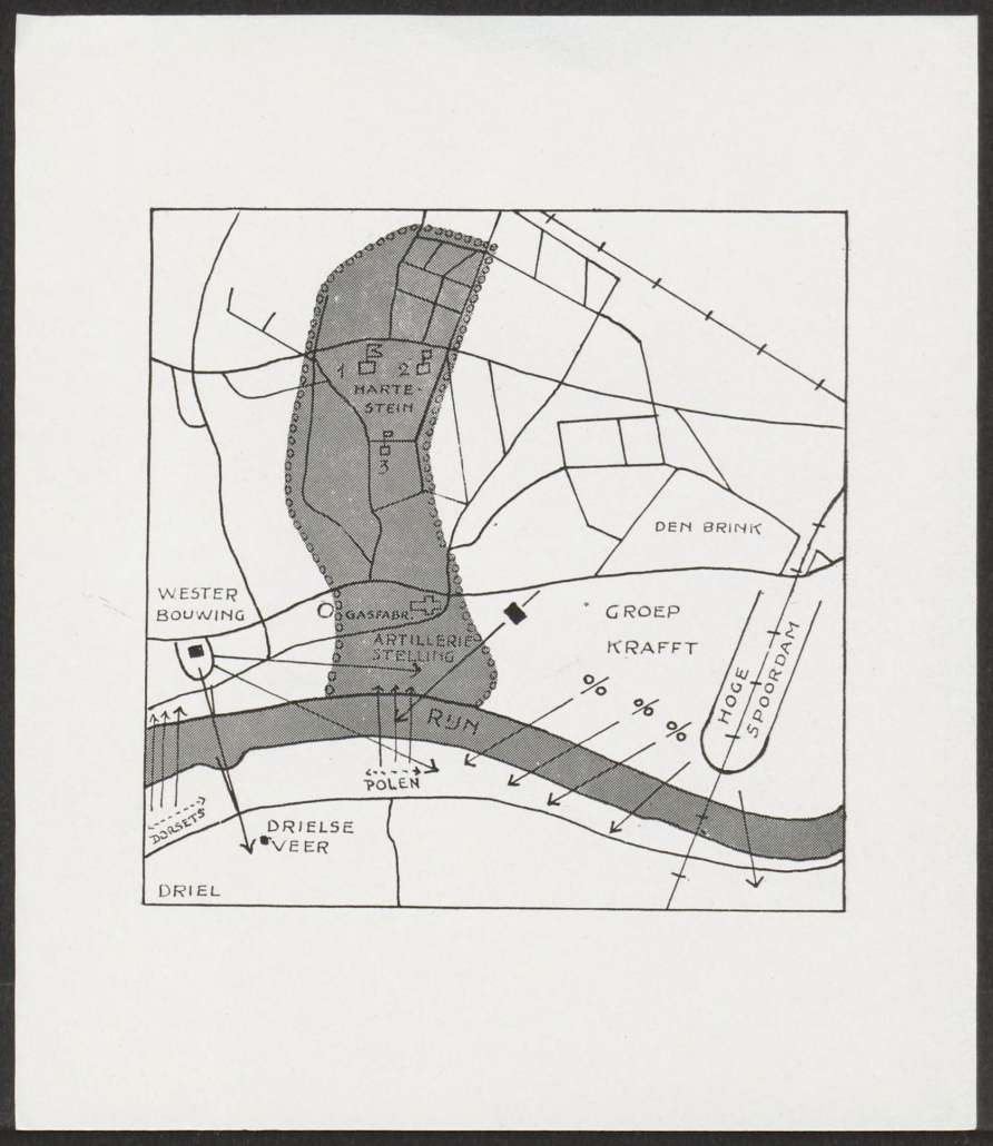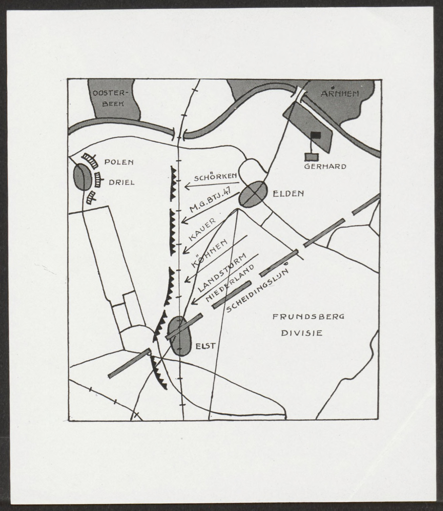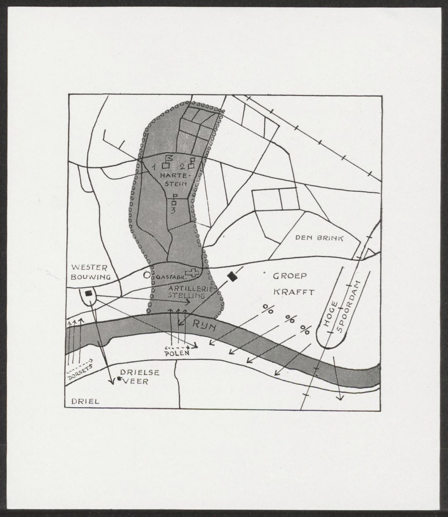 N.B. Kopieën van 23 door Boeree eigenhandige gemaakte kaarten (kwarto-formaat) waarop de troepenbewegingen en posities tijdens de belangrijkste fasen van de Slag om Arnhem zijn ingetekend. Een aantal van de hier beschreven schetsen heeft gediend als basismateriaal voor de grotere formaten die Boeree maakte met het oog op lezingen (zie nr. 52) en voor de calques met bijbehorende lichtdrukken die door de Arnhemse Dienst van Gemeentewerken zijn vervaardigd (zie nr. 53). Vgl. ook de nrs. 3c en 3e van dit overzicht.Kaarten van Boeree