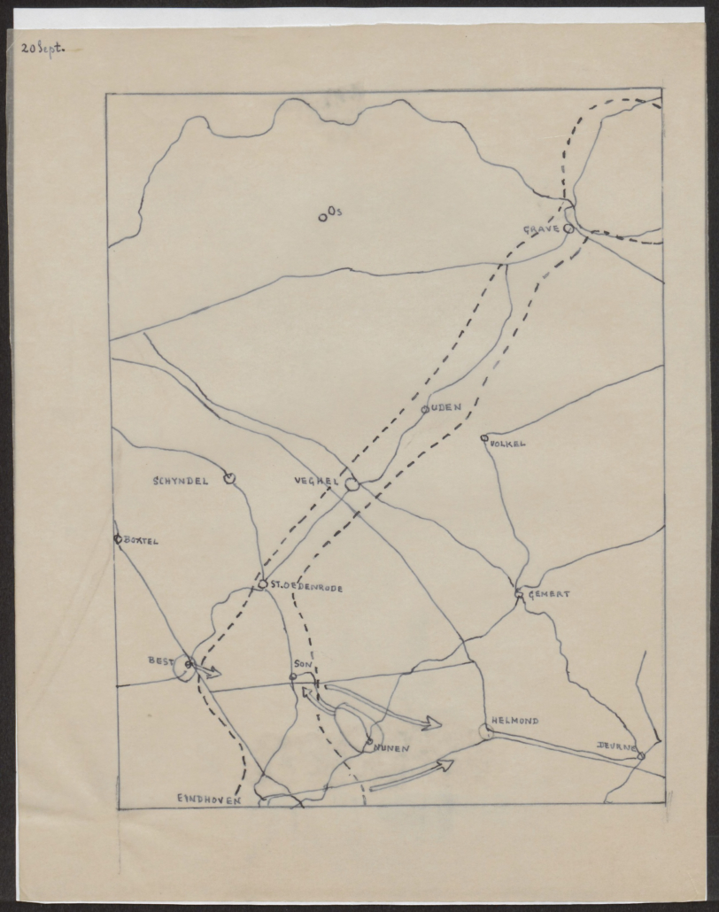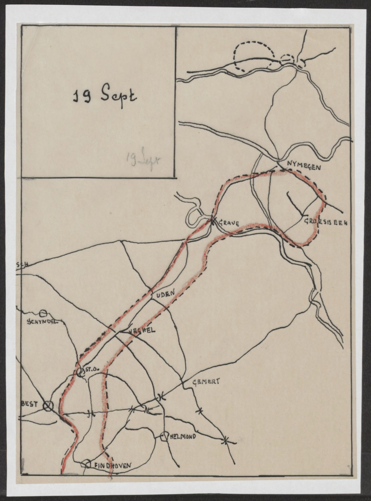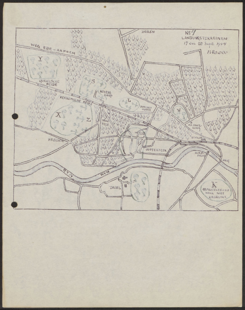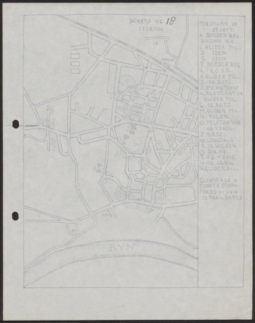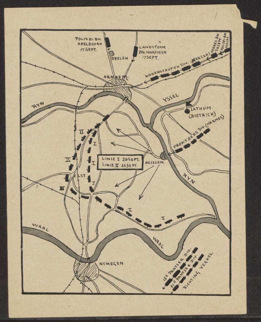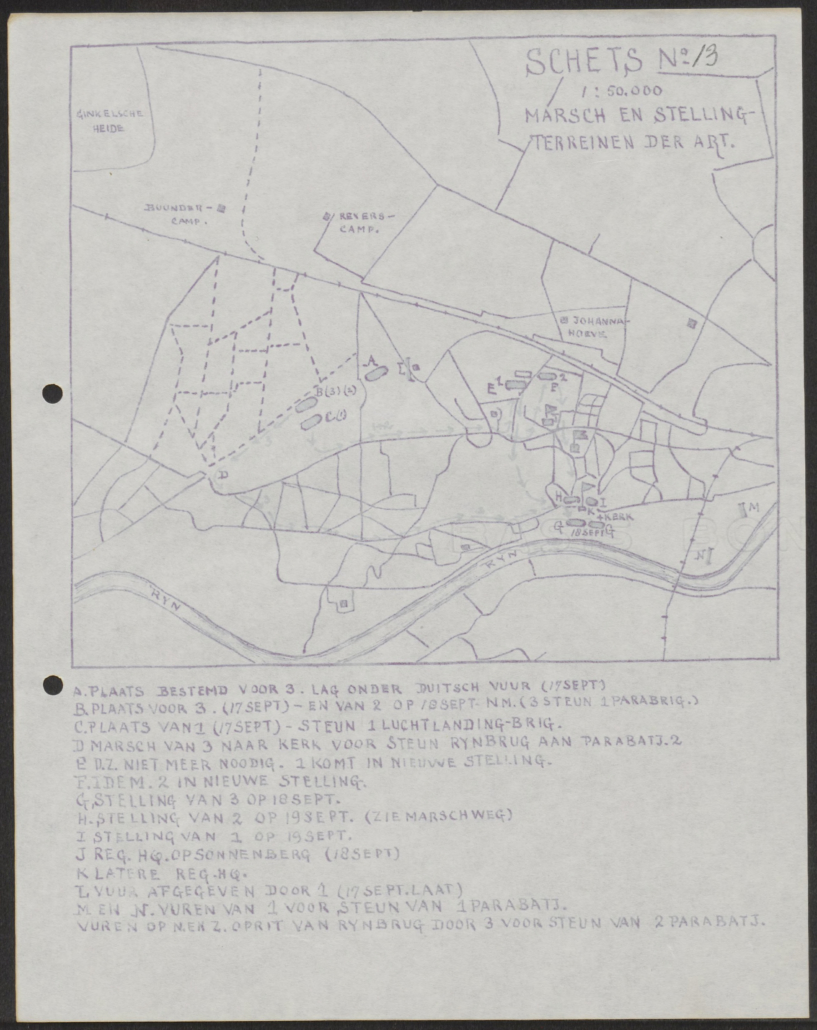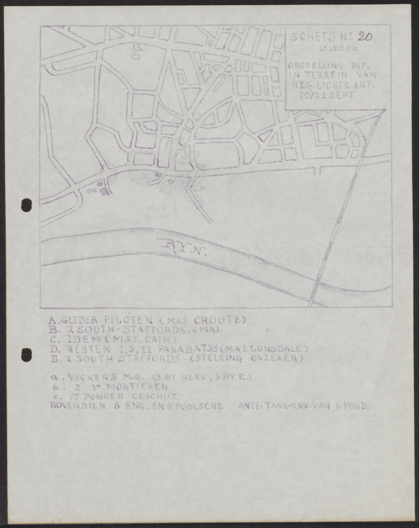 N.B. Kopieën van 23 door Boeree eigenhandige gemaakte kaarten (kwarto-formaat) waarop de troepenbewegingen en posities tijdens de belangrijkste fasen van de Slag om Arnhem zijn ingetekend. Een aantal van de hier beschreven schetsen heeft gediend als basismateriaal voor de grotere formaten die Boeree maakte met het oog op lezingen (zie nr. 52) en voor de calques met bijbehorende lichtdrukken die door de Arnhemse Dienst van Gemeentewerken zijn vervaardigd (zie nr. 53). Vgl. ook de nrs. 3c en 3e van dit overzicht.Kaarten van Boeree