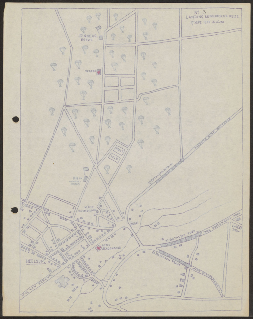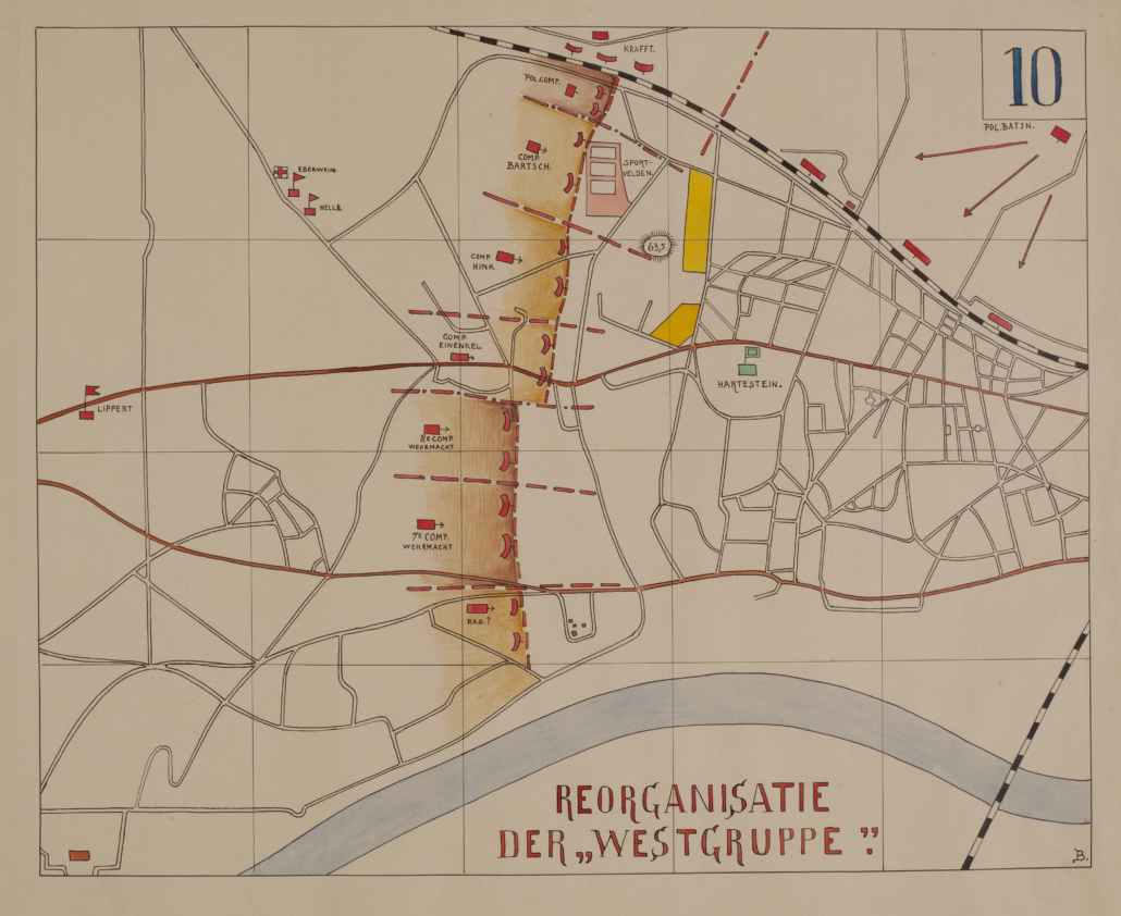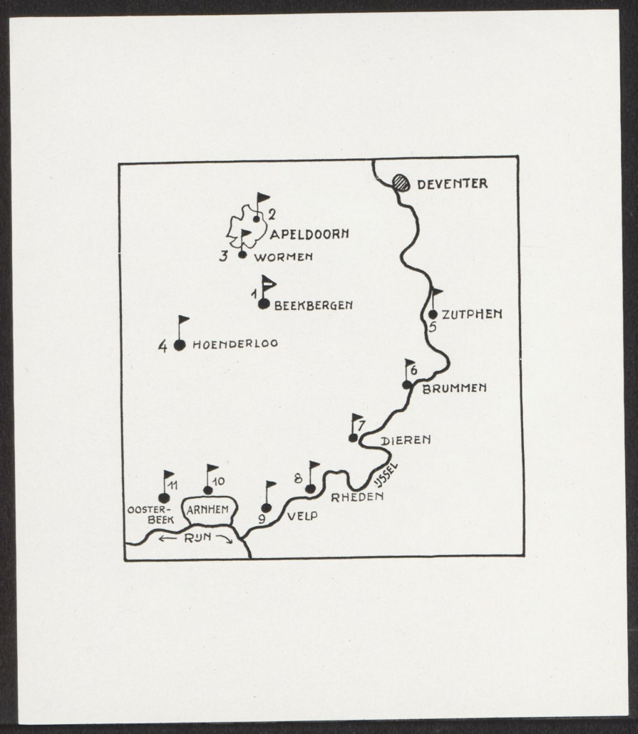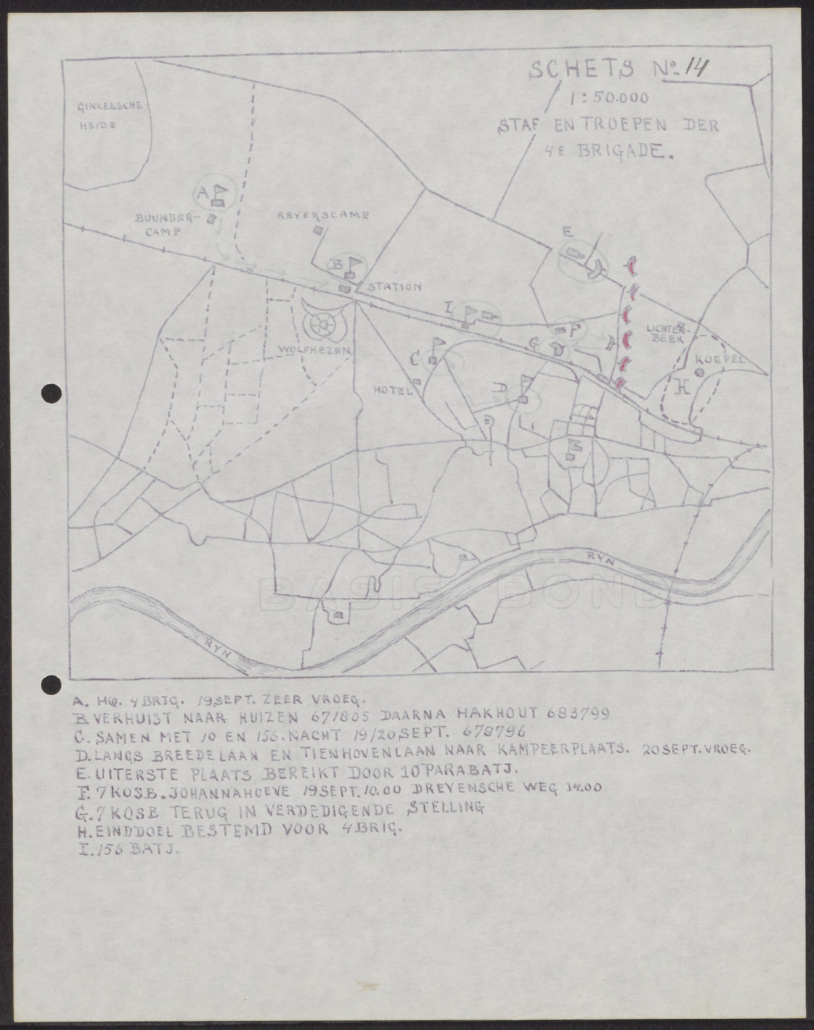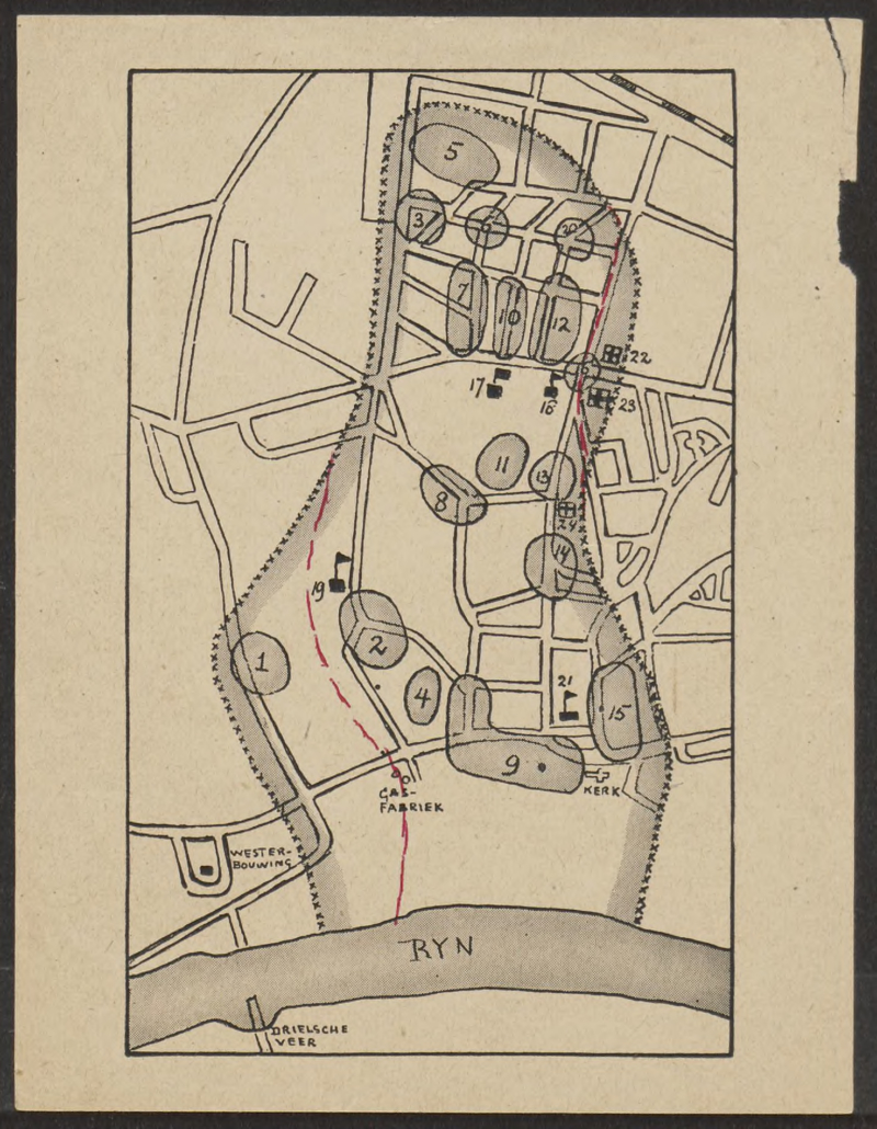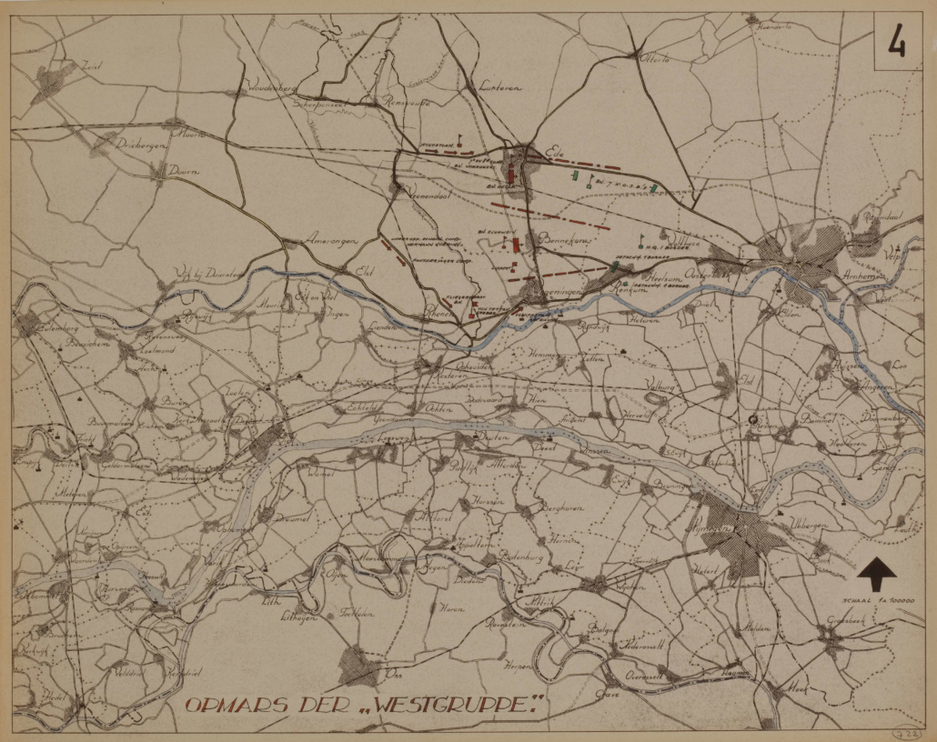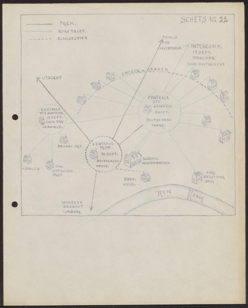 N.B. Kopieën van 23 door Boeree eigenhandige gemaakte kaarten (kwarto-formaat) waarop de troepenbewegingen en posities tijdens de belangrijkste fasen van de Slag om Arnhem zijn ingetekend. Een aantal van de hier beschreven schetsen heeft gediend als basismateriaal voor de grotere formaten die Boeree maakte met het oog op lezingen (zie nr. 52) en voor de calques met bijbehorende lichtdrukken die door de Arnhemse Dienst van Gemeentewerken zijn vervaardigd (zie nr. 53). Vgl. ook de nrs. 3c en 3e van dit overzicht.Kaarten van Boeree