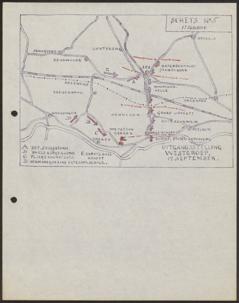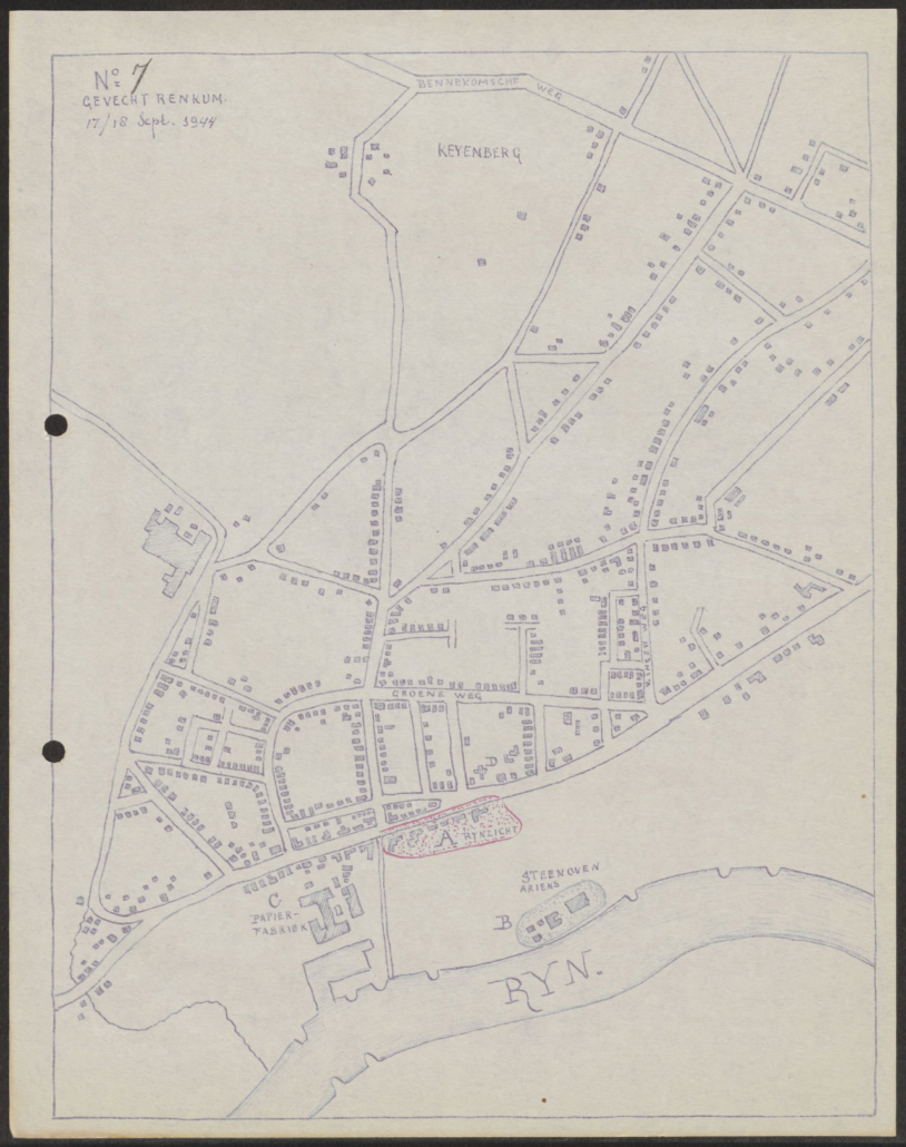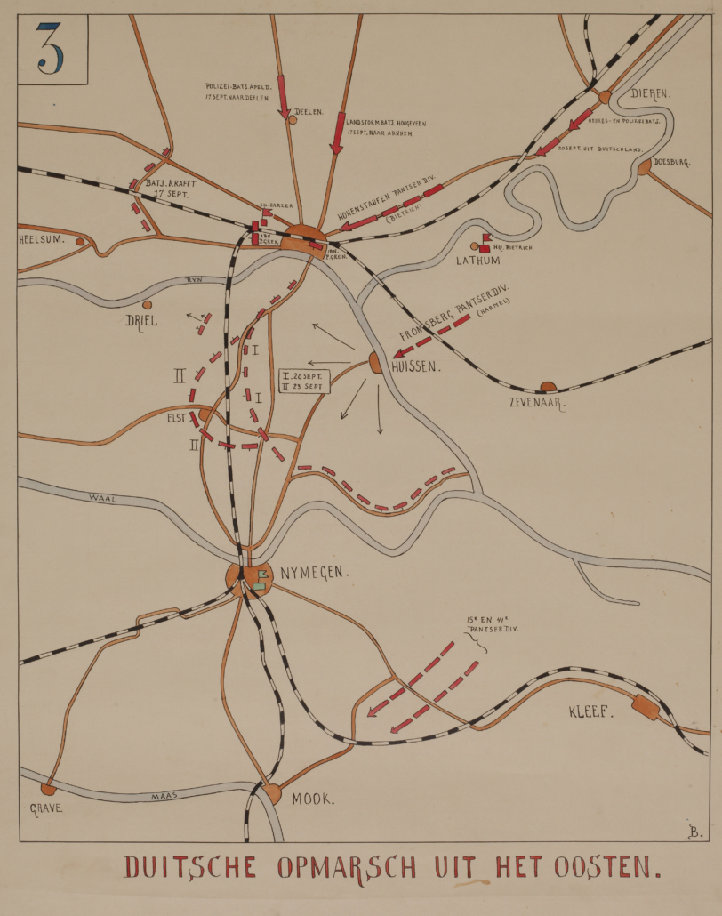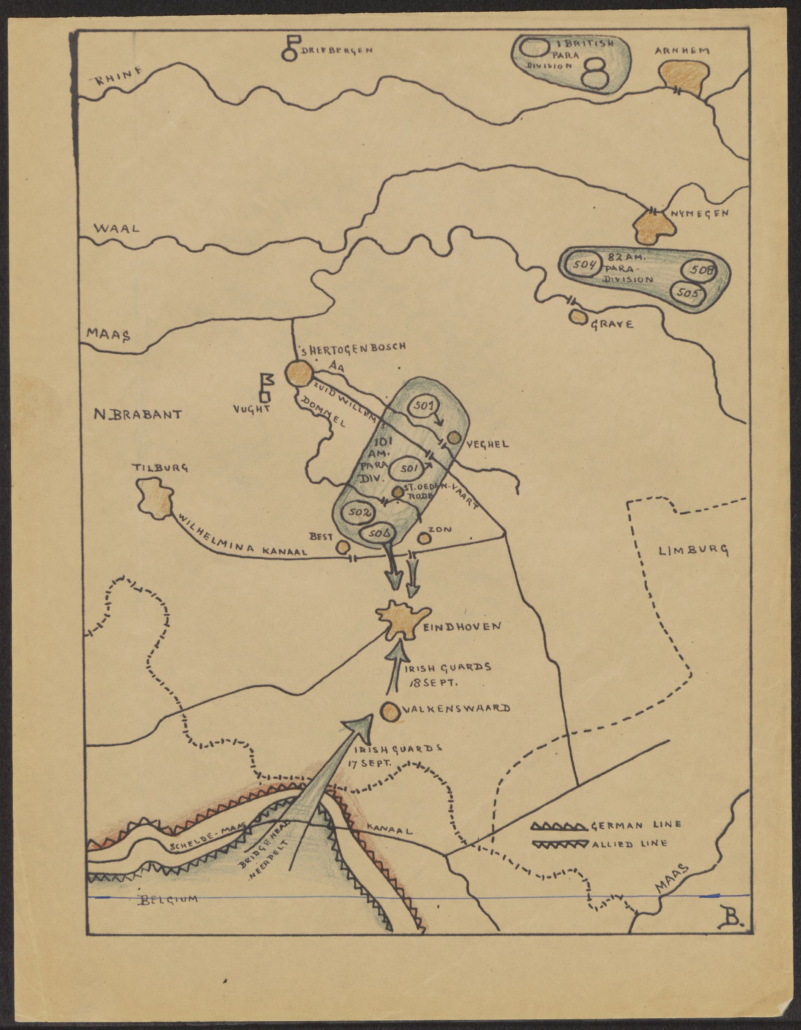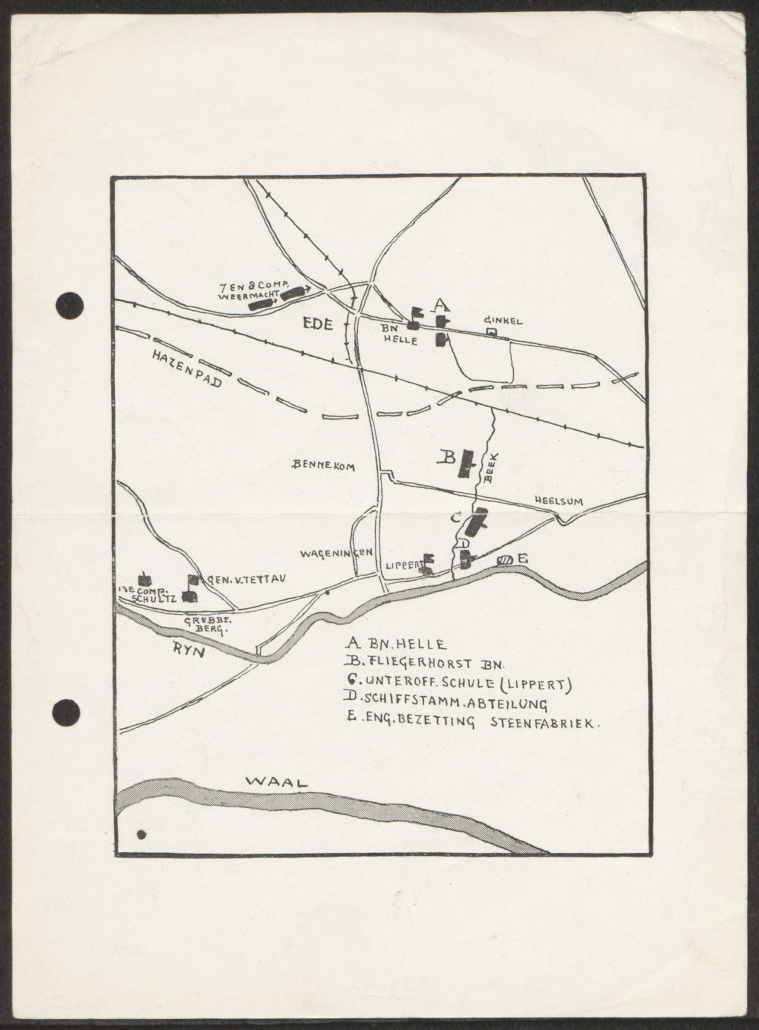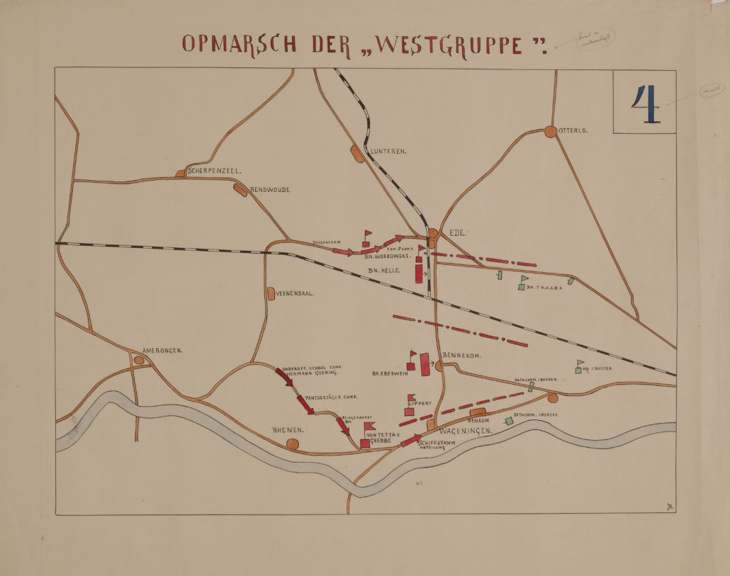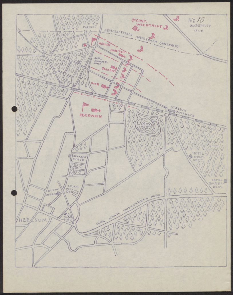 N.B. Kopieën van 23 door Boeree eigenhandige gemaakte kaarten (kwarto-formaat) waarop de troepenbewegingen en posities tijdens de belangrijkste fasen van de Slag om Arnhem zijn ingetekend. Een aantal van de hier beschreven schetsen heeft gediend als basismateriaal voor de grotere formaten die Boeree maakte met het oog op lezingen (zie nr. 52) en voor de calques met bijbehorende lichtdrukken die door de Arnhemse Dienst van Gemeentewerken zijn vervaardigd (zie nr. 53). Vgl. ook de nrs. 3c en 3e van dit overzicht.Kaarten van Boeree