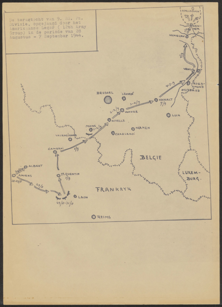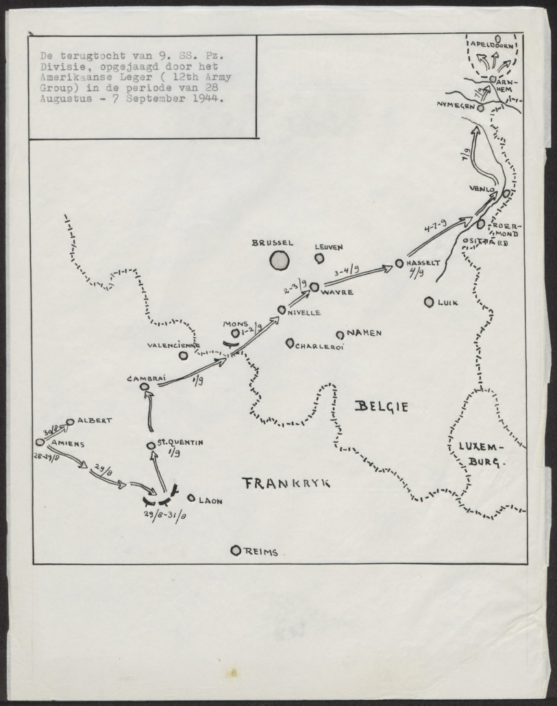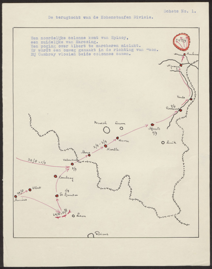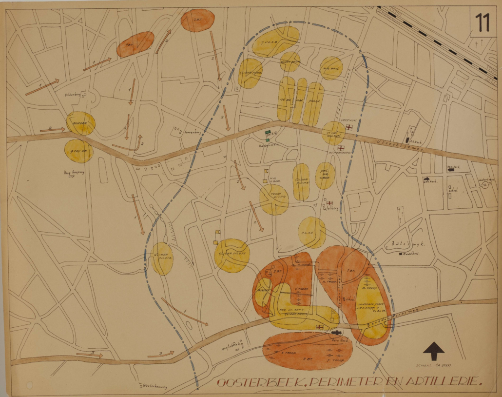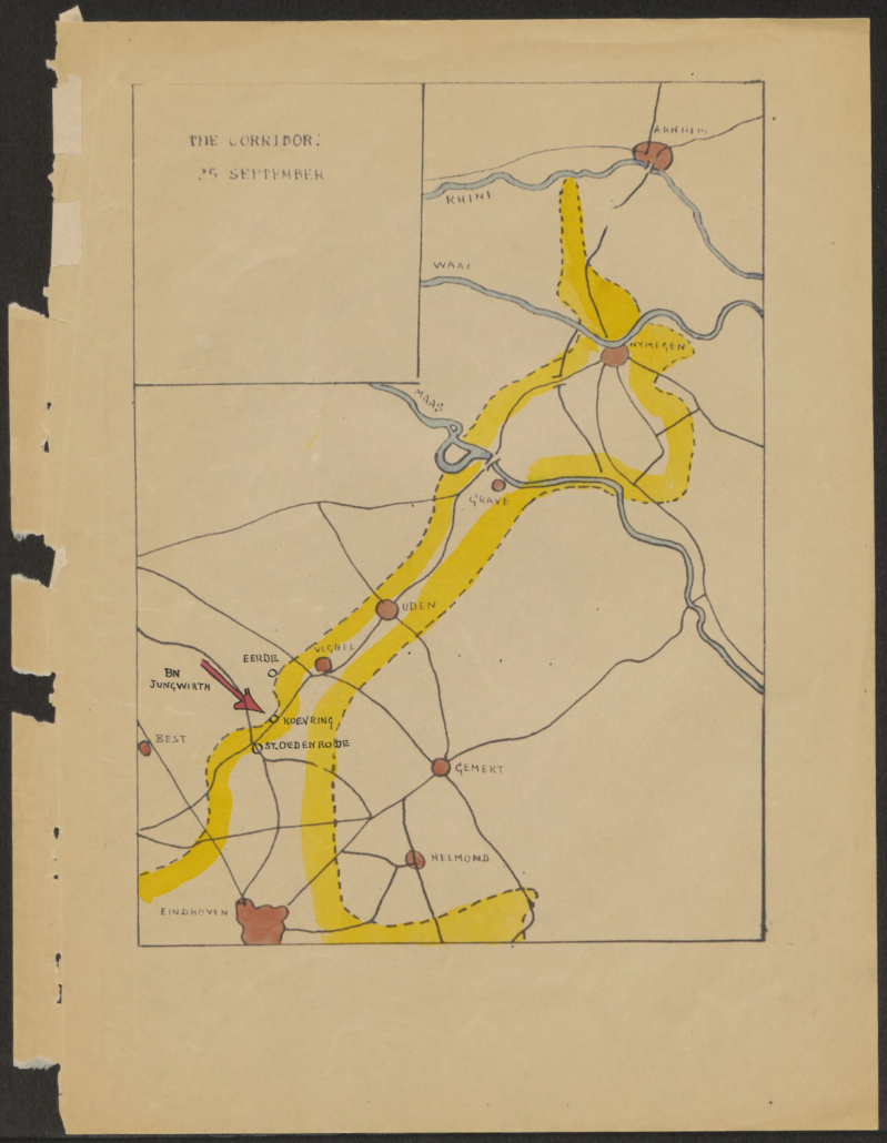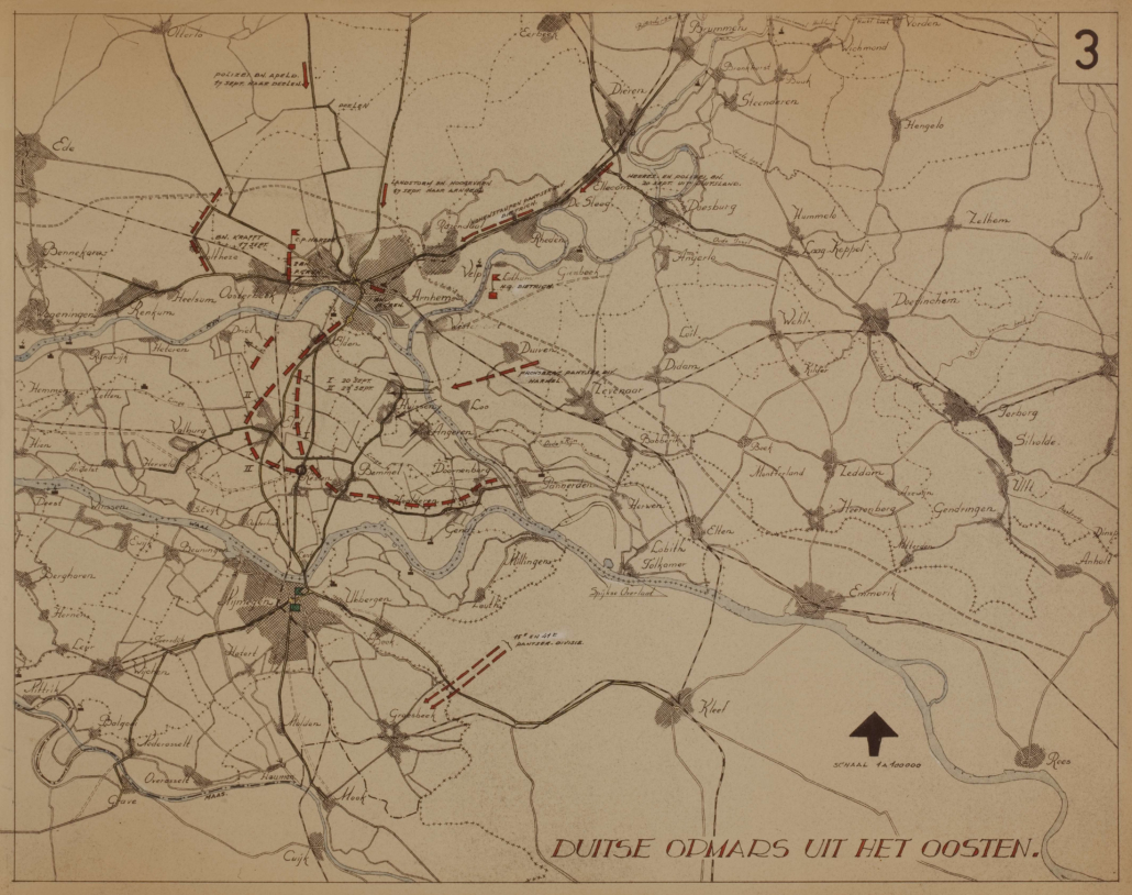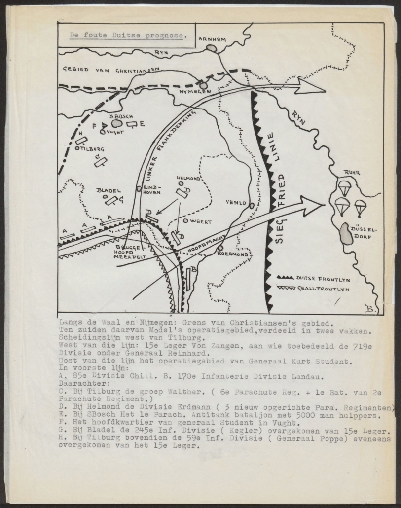 N.B. Kopieën van 23 door Boeree eigenhandige gemaakte kaarten (kwarto-formaat) waarop de troepenbewegingen en posities tijdens de belangrijkste fasen van de Slag om Arnhem zijn ingetekend. Een aantal van de hier beschreven schetsen heeft gediend als basismateriaal voor de grotere formaten die Boeree maakte met het oog op lezingen (zie nr. 52) en voor de calques met bijbehorende lichtdrukken die door de Arnhemse Dienst van Gemeentewerken zijn vervaardigd (zie nr. 53). Vgl. ook de nrs. 3c en 3e van dit overzicht.Kaarten van Boeree