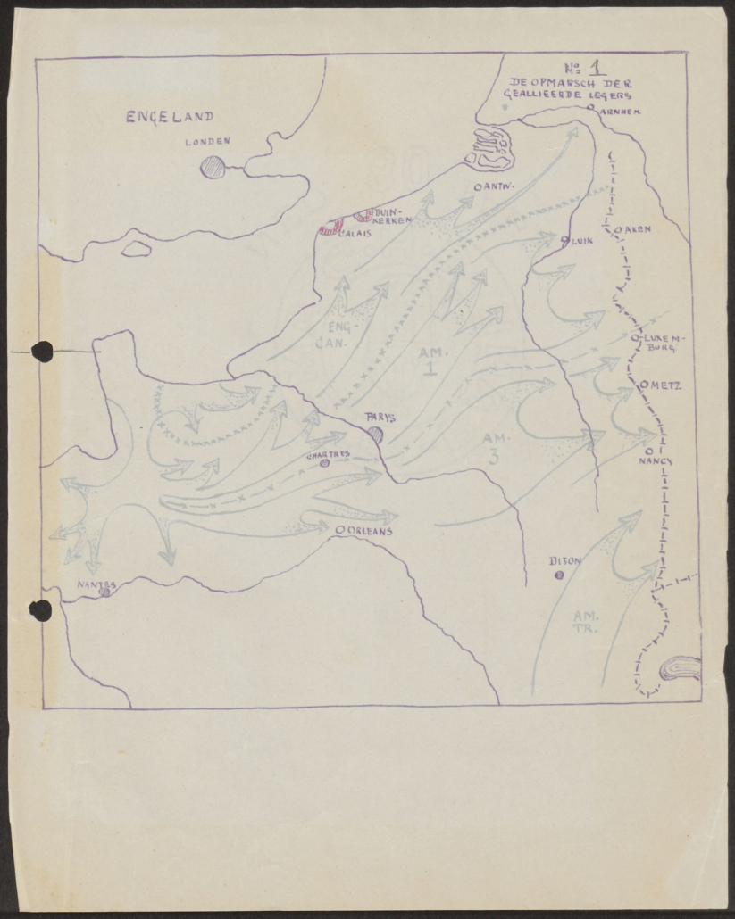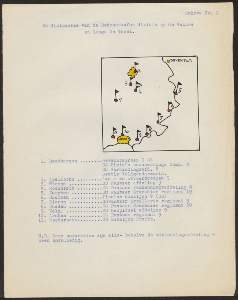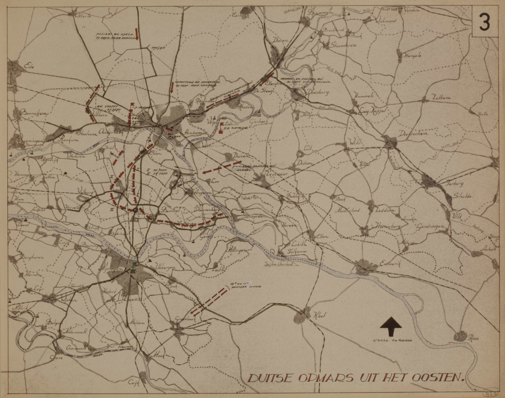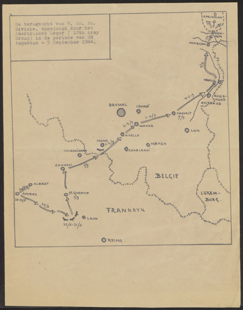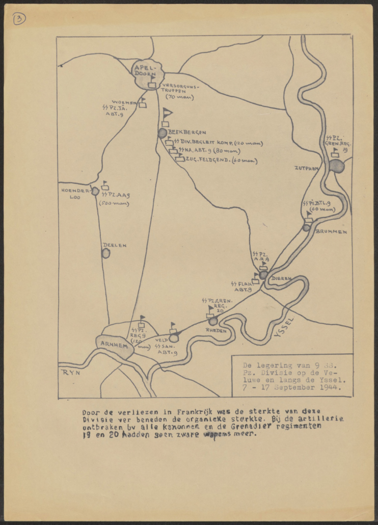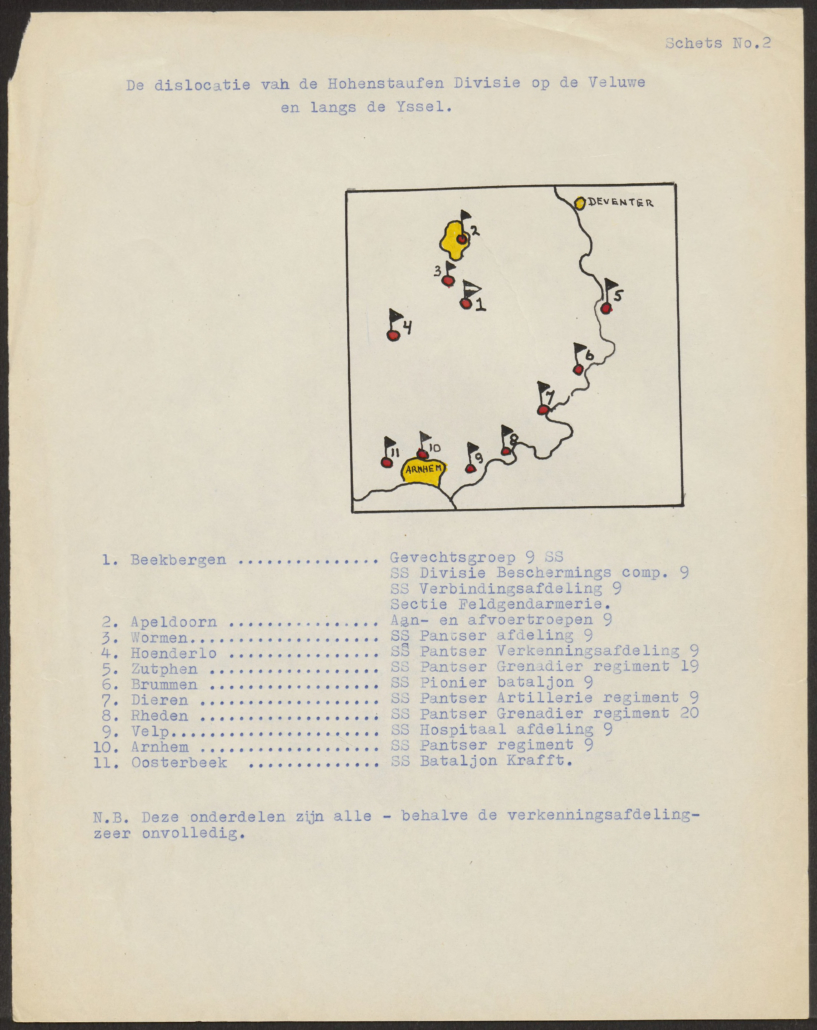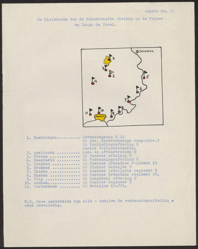 N.B. Kopieën van 23 door Boeree eigenhandige gemaakte kaarten (kwarto-formaat) waarop de troepenbewegingen en posities tijdens de belangrijkste fasen van de Slag om Arnhem zijn ingetekend. Een aantal van de hier beschreven schetsen heeft gediend als basismateriaal voor de grotere formaten die Boeree maakte met het oog op lezingen (zie nr. 52) en voor de calques met bijbehorende lichtdrukken die door de Arnhemse Dienst van Gemeentewerken zijn vervaardigd (zie nr. 53). Vgl. ook de nrs. 3c en 3e van dit overzicht.Kaarten van Boeree