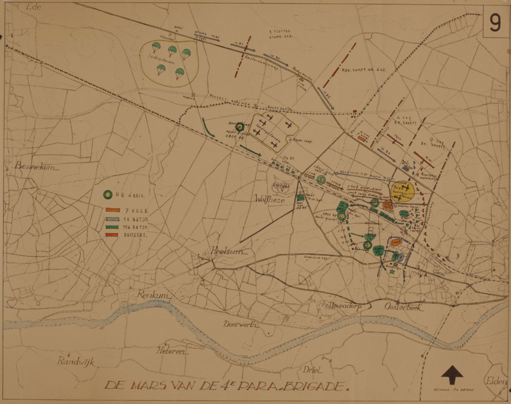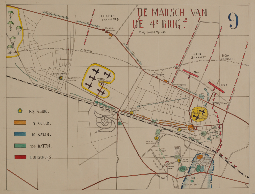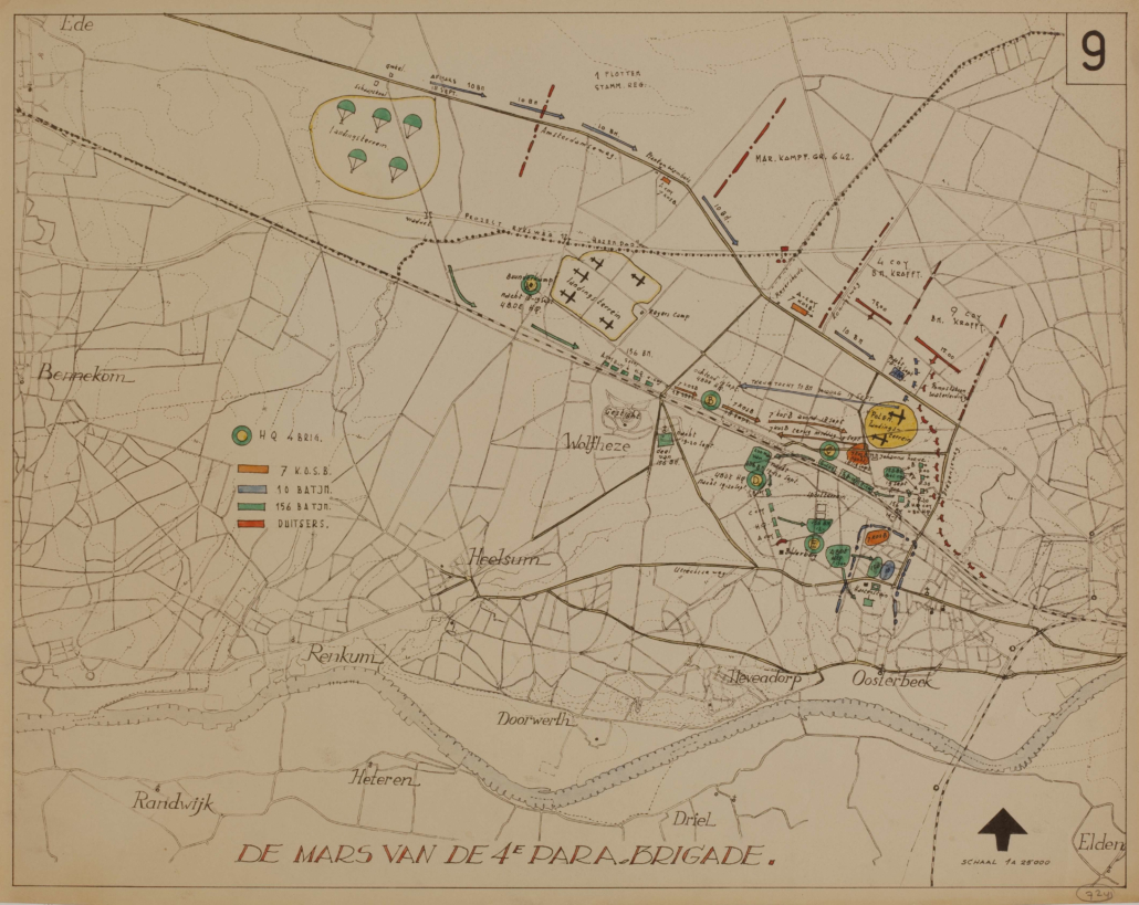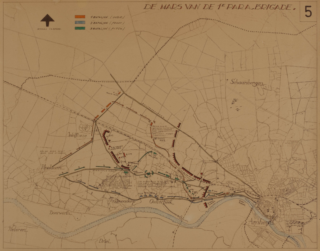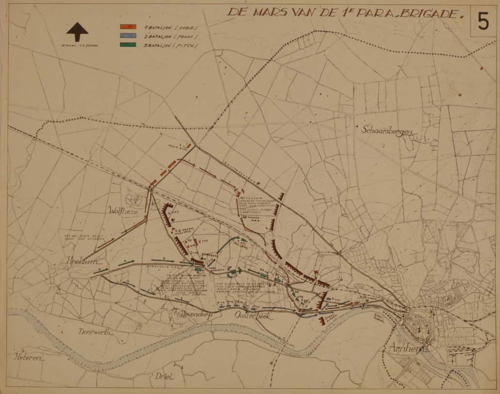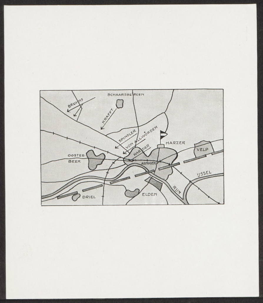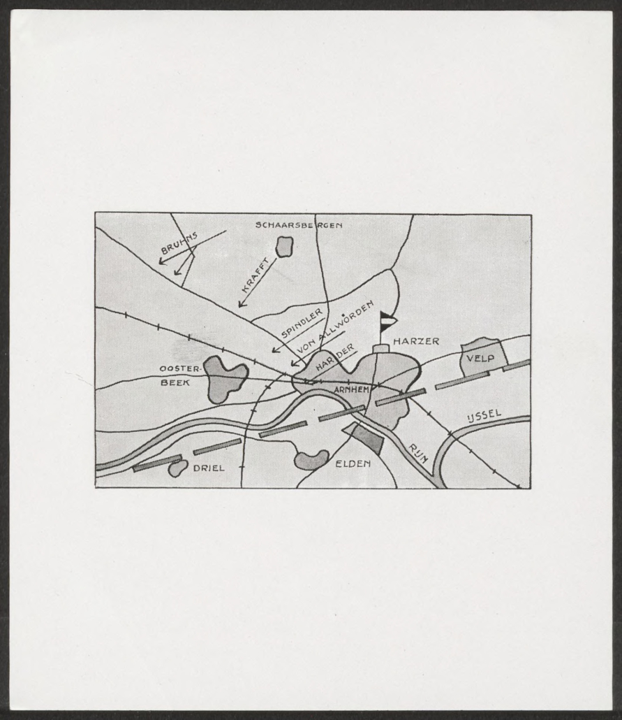 N.B. Lichtdrukken van (niet meer aanwezige) calques, door de Arnhemse Dienst van Gemeentewerken vervaardigd op aanwijzingen van Boeree, aan de hand van de in nr. 51 vermelde originele getekende kaarten. Van kaart 2 is kennelijk geen calque gemaakt; in elk geval ontbreekt de lichtdruk. Toegevoegd is een nieuwe kaart 5: “De marsch van de 1e Para-Brigade”; de oorspronkelijke kaart 5 (“De mislukte doorbraak”) heeft hier het nummer 5a gekregen. De gegevens van kaarten 8 en 12 zijn hier op één blad gecombineerd. Van een aantal kaarten zijn meer exemplaren aanwezig.