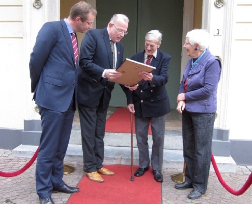 Bijlage Foto: John Waddy krijgt de oorkonde overhandigd behorende bij het Erelidmaatschap van de Ver. Vrienden van het Airborne Museum in september 2013. (Van links naar rechts: Ivar Goedings, Secretaris VVAM, Voorzitter Ben Kolster, Kolonel John Waddy OBE en Wil Rieken, Lid van Verdienste VVAM.)