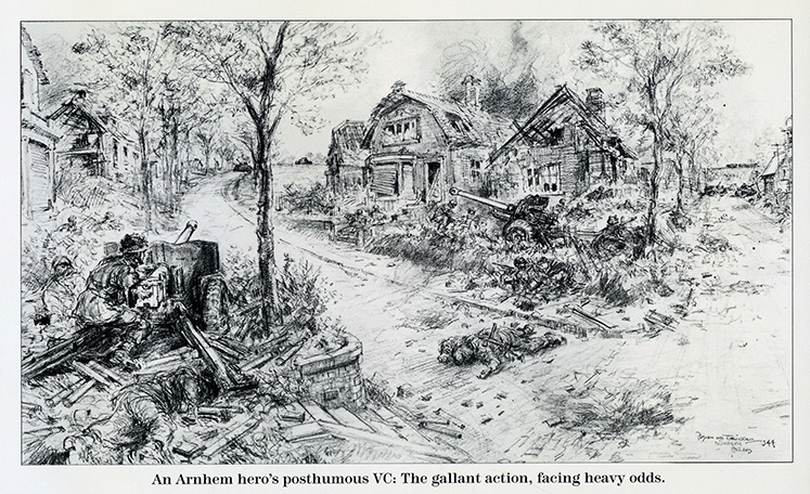 In de London Gazette van december 1944 werd deze schets van Bryan de Grineau gepubliceerd. Aan de linkerzijde is Lance-Sergeant Baskeyfield zichtbaar met zijn No.1 Gun. Aan de overkant het kanon van Corporal Wade. Opvallend is dat er twee versies van deze tekening zijn. Het verschil is de soldaat op het wegdek. Op deze versie ligt hij levenloos op de straat en op de andere versie kruipt hij richting het stuk wat bediend wordt door Lance-Sergeant Baskeyfield. (Tekening via: B. Gerritsen)