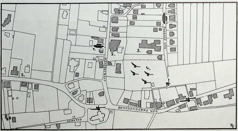 Kaartje van een deel van het Benedendorp in Oosterbeek.De gearceerde bebouwing is tijdens of na de Slag bij Arnhem verwoest of zwaar beschadigd.1.De duitse Königstiger in de Be¬neden Weverstraat;2.De Oude School;3.Wasserij Van Hofwegen;4.Batterij 75 mm houwitzers;5 Wasserij Van Dolderen.