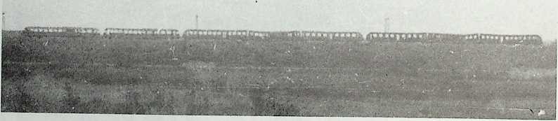 De trein op de spoordijk bij Oosterbeek, gefotografeerd op 24 september 1945. Duidelijk is te zien dat de trein is samengesteld uit twee korte (elektrische) treinstellen en twee lange (diesel) treinstellen.( foto: Ir.J.Voskuil ).