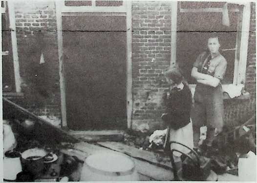 De plaats van de mortieropstelling in 1946. Beide zusjes Breman, destijds 11 en 15 jaar, staan bij de achterdeur.