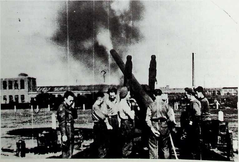 Een stuk van het 64e Medium Regt.in actie in de nabijheid van de Electrische Centrale.