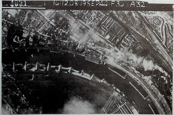 Luchtfoto van de omgeving van het Rijnhotel in Arnhem, 19 september 1944.