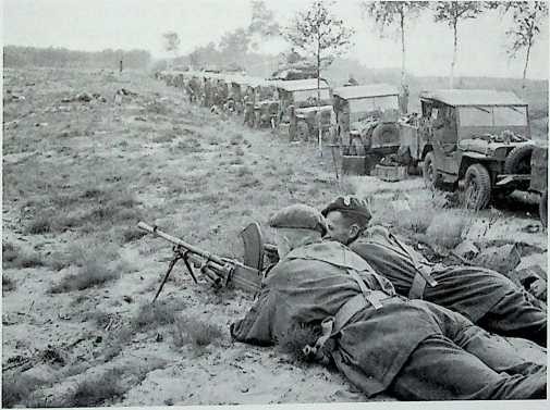 “Op de 21e reden we door Eindhoven en gingen met een slakkegang verder, op aan staart. Het werd nacht en we hadden slechts het lampje op het voertuig voor ons als gids. Ik was derde in de kolonne. Eerste was de bevelvoerende officier. Major R.D. Sellon, dan kwam Captain the Hon. J.B. Coventry, en vervolgens ik. Plotseling zagen we vanuit het noorden een voertuig aankomen, dat snel reed en groot licht voerde. Ik hoorde de commandant roepen: ‘Doe die verdomde lampen uit!’ De auto stopte en ik hoorde een officier zeggen: ‘Ga met uw kolonne van de weg af. De Ist Airborne zit in de problemen. We jagen 43rd Wessex er door. Ik kreeg op¬dracht naar achteren te rijden en de rest van de kolonne aan de kant van de weg te zetten. Mijn chauffeur keerde onze jeep en we reden de duisternis in. Na on¬geveer 10 voertuigen waren er geen meer! ‘Waar zijn ze, verdomme?’, dacht ik.