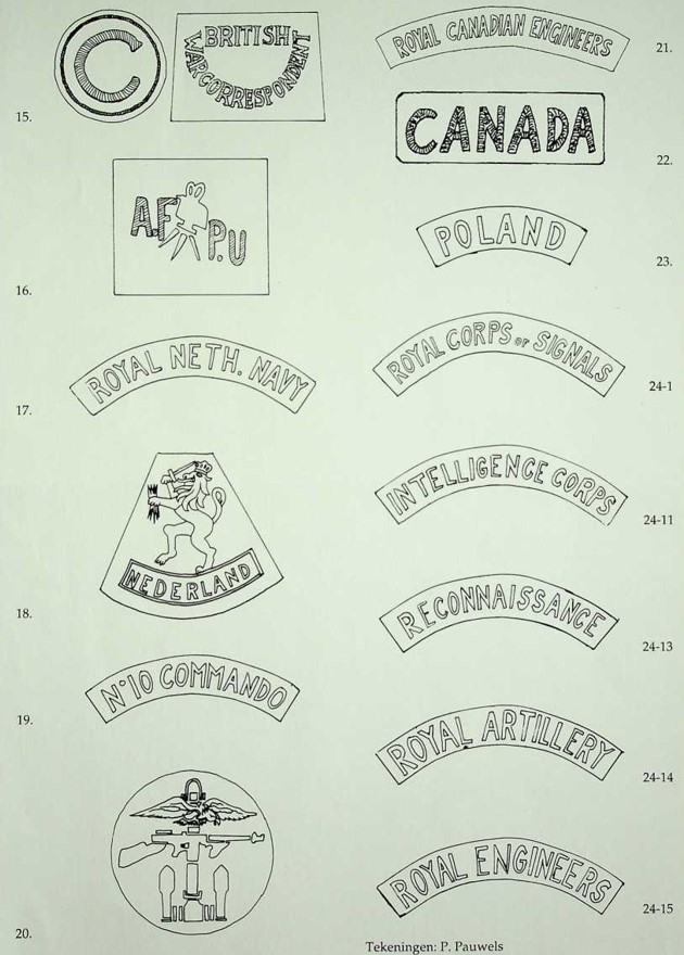 17. “ROYAL NETH. NAVY”: Dit embleem is tijdens de Slag om Arnhem door één persoon gedragen: lui-tenant ter zee A. Wolters, een van de Engelandvaarders. Hij was de assistent van de beoogde stadscommandant van Arnhem als de militaire operatie was gelukt. Van dit embleem droeg Wolters een geborduurde versie. Het bestaan van gedrukte exemplaren is niet bekend.