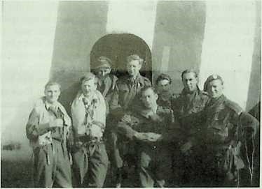 Zondag 17 september 1944, vliegveld Keevil. De bemanning van Stirling LK-544 van 299 Squadron poseert met de twee piloten van het zweefvliegtuig dat die dag naar Arnhem moet worden gesleept. Van links naar rechts: W/O A.G. Brown, piloot; F/Sgt N. Ledward, radio-telegrafist; F/Lt L.N. Bussey, navigator; Sgt ].D. Firth, boordwerk- tuigkundige; W/O /.W. Eady, bommenrichter; W/O D.T. Lewis, staartschutter, en de twee gliderpiloten. Van de laatsten weet de auteur slechts één naam: Ted Legg. David Lewis zou graag in contact willen komen met zijn voormalige kameraden. Wie helpt? (foto: collectie David Lewis)