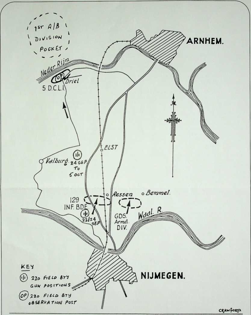 Tijdens de nacht van 24 op 25 september kwam de divisie-artillerie, ondersteund door 147th Field Regiment en 64th Medium Regiment, in actie ten behoeve van de oversteek van de Rijn door 4th Battalion The Dorsetshire Regiment, dat een dappere maar helaas mislukte poging ondernam om de steeds kleiner wordende perimeter van Ist Airborne Division in Oosterbeek te versterken. Twee van onze Regimental Forward Observation Post eenheden, de kapiteins Tom ‘Zeke’ Rosé MC (Military Cross) en A.