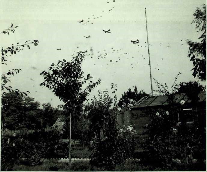 De afbeelding toont een tuin met gras, boompjes en planten. Rechts staat een houten schuur met daarachter een lange houten paal. Links op de achtergrond is een deel van de gevel van een huis te onderscheiden, met op de eerste verdieping twee ramen. In de lucht zijn zes vliegtuigen van het type Short Stirling zichtbaar, samen met tientallen parachutes.