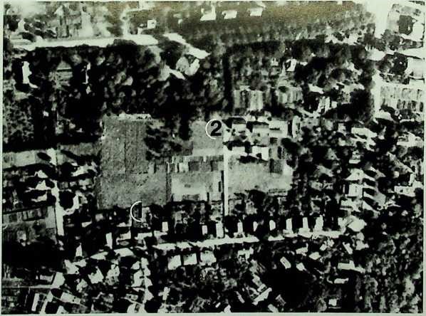 Vergroting van een deel van een verkenningsfoto van 6 september 1944, waarop in het midden duidelijk het open terrein tussen de Graaf van Rechterenweg en de Cronjéweg zichtbaar is. Bij ‘1’ huize Zonnewende, met daarachter haaks op de weg de op foto BU 1092 afgebeelde, langwerpige schuur. Bij ‘2’ het huis van landbouwer Jansen, waarvan de voorgevel op de foto van Smith zichtbaar is. Zie ook de kaart op de volgende pagina. (Foto: collectie R. Voskuil)