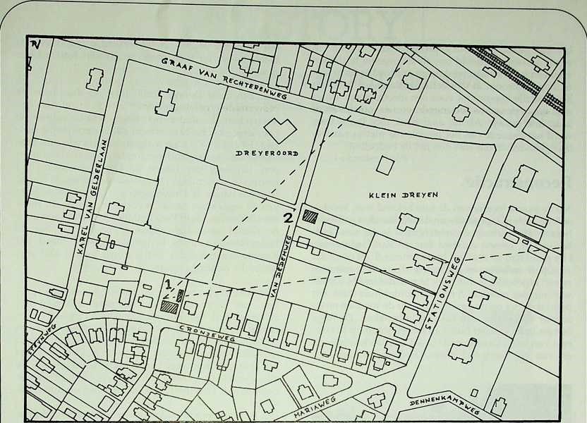 Nu de exacte locatie van de foto bekend was, konden ook de andere topografische details worden geïdenti-ficeerd. Het huis op de achtergrond is dat van land-bouwer H. Jansen en staat aan de Van Dedemweg. Het pand had in 1944 het huisnummer 5, en nu is dat 11. Óp de luchtfoto en het kaartje die in deze ministo- ry zijn afgebeeld, is duidelijk te zien dat rechts van de woning met nummer 5 nog een ander huis staat. Dit pand is echter op de grondfoto, door de struiken en de schuur in de tuin, aan het oog onttrokken. De hoge bomen links van het huis van Jansen staan op het ter-rein van hotel Dreyeroord (Graaf van Rechterenweg) en van het landgoed Klein Dreijen (Stationsweg).