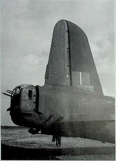 De karakteristieke, bijna acht meter hoge, staart van de Harense Stirling. Vóór het richtingsroer is het kenmerkende rood-ivit-blauive herkenningsteken geschilderd, dat aan- geejt dat het toestel van de RAF is. Onder de staart bevindt zich een beugel die is aangebracht om bij abnormale vliegbe-wegingen tijdens het slepen van een zweefvliegtuig, de romp te beschermen tegen het snijdende geweld van de strakge-spannen trekkabel. Dit geeft aan dat het om een transport- uitvoering gaat van een Short Stirling bommenwerper. Ook illustreert deze foto op fraaie wijze het gezegde: het venijn zit in de staart. Daar bevindt zich een geschutskoepel met een 0.303 Browning machinegeweer (vier lopen). Deze foto (gemaakt op zondag 24 september 1944 door Leo v.d. Bergh uit Oss) is vanuit een artistiek en historisch oogpunt gezien volgens ons een voltreffer.
