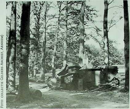 In de richting van de Utrechtseweg vonden zware ge-vechten plaats. Waarschijnlijk probeerden de Duitsers vanuit het westen via de hoofdweg door te breken. De bomen in die richting stonden in brand. Plotseling hoorden we het huilende geschreeuw van de een of andere arme ziel. Het klonk door het hele bos, en het gevecht leek er door te luwen. Het ging een paar minuten door totdat het over ging in snikken. Links van ons riep iemand dat de man was getroffen door een vlammenwerper. Ik weet niet of hij Duits of Brits was, maar hij had in ieder geval onze sympathie.7)