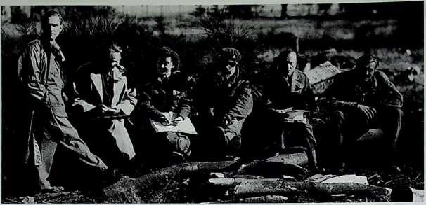 Brian Desmond Hurst houdt geïmproviseerd werkoverleg. V.l.n.r. Victor Wark, Brian Desmond Hurst, Doreen North, Major Hugh Maguire, Major’Boy’ Wilson en (vermoedelijk) Captain David Treharne. (Foto: Victor Wark Collection)