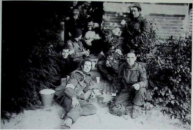 18 september 1944. Een groepje Britse militairen van de ‘HQ Company’ van het ‘Ist Parachute Battalion’, waaronder enkele hospitaal-soldaten, rust uit op de stoep bij de voordeur van het huis Hulkesteinseiveg 16 in Arnhem. Sergeant Hayden is de zittende militair met helm, die naar beneden kijkt. (Foto: C. Folmer, Collectie Niall Cherry)