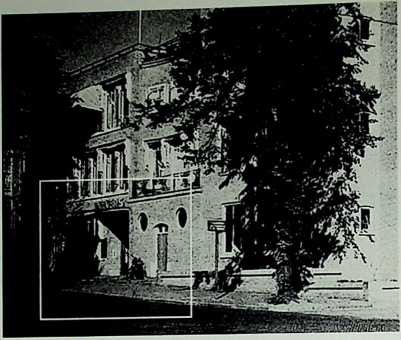 Het meest opvallende element lijkt de betonnen luifel; als er een gebouw in Arnhem was met zoiets, dan moet dat te vinden zijn. Het virtueel aflopen van de route van Jacobsen en Wenzel via het foto-materiaal van vooral de website van het Gelders archief leverde geen resultaat op. Eén gebouw aan de Bovenbergstraat dat er tegenwoordig niet meer is, verdiende nadere aandacht, omdat daar de ingang van het Instituut Schoevers zat1, mogelijk dat die zo’n luifel had. Lang zoeken leverde een foto op (figuur 2),