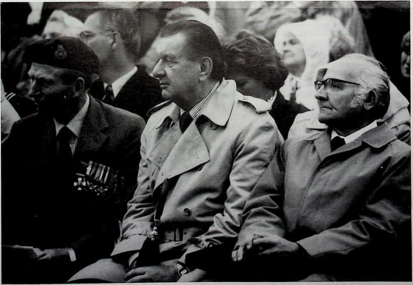 Attentive listeners during the commemoration of the Battle of Arnhem in Driel. From left to right: Major-General A.J.Deane-Drummond,leader of the Pilgrimage, and Messrs. R.Gasowski and J. Lorys.representatives of the Polish Airborne Forces Association. (photo:B.de Reus.)