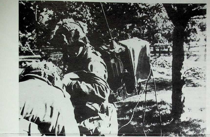 Members of the First Polish Independent Para Brigade with a transmitter- receiver in an orchard near Driel: an example of the Communications apparatus on show during the exhibition “Calling Sunray” to be held in the Airborne Museum from March 22nd till April 22nd.