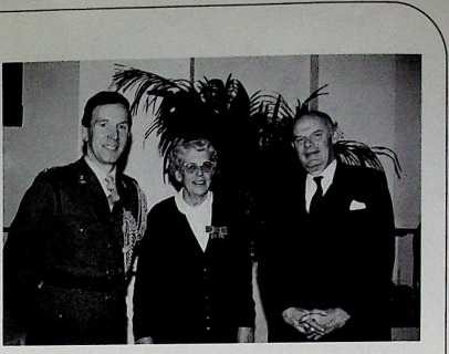 Our member Mrs. G.J.H. (Trims) Oosterhaar receives the insignia of the MBE (Member of the British Empire) from the hands of the British Ambassador Sir David Miers on the 19th of September 1993 (see also Newsletter No. 50). On the left is the British Military Attache Lt-Col. John Young.