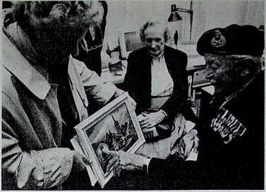 During a visit to the Airborne Museum General Sir John Hackett is presented with a small painting of the house in Ede where he was in hiding in the autumn of 1944. Mrs. Urquhart looks on with interest.