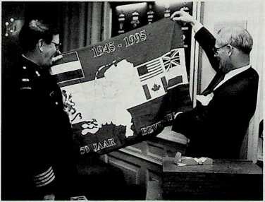 Following the opening of “De Bevrijders” exhibition on 5 April 1995, the chairman of the Airborne Museum Foundation, drs. J.W.A.M. Verlinden, presents Canadian military attache Colonel F.K. Laforge with a “50 jaar bevrijding” (50 years liberation) flag.