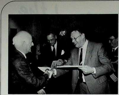 5 April 1995. Chris van Roekel, compiler of the Schools Project, hands over the first copies to the chairman of the Society of Friends, drs J. Smits (left), and to Mr. Verlinden, chairman of the Airborne Museum Foundation (centre).