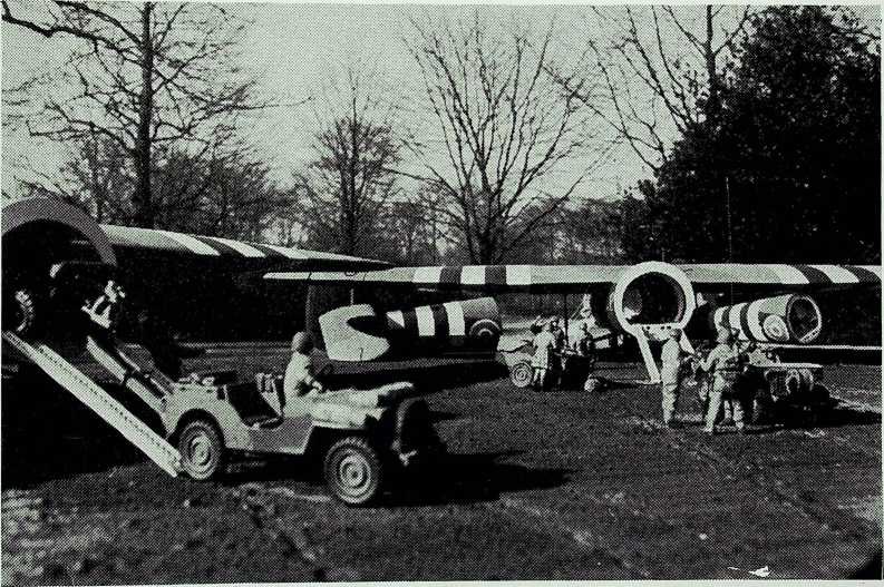 The tail sections of the other Horsas have been removed. Runners have been slinned out and jeeps, a trailer and a six-pounder anti tank gun are driven out of the gilders.