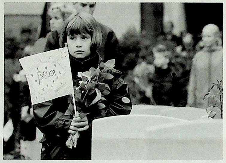 23 September 2001. Following the September 1’1 attacks in the United States, the children who laid flowers on the graves in the Airborne Cemetery had made small flags bearing either the word ‘Vrede’ or ‘Peace’. After the memorial service the children gave the flags to the veterans.
