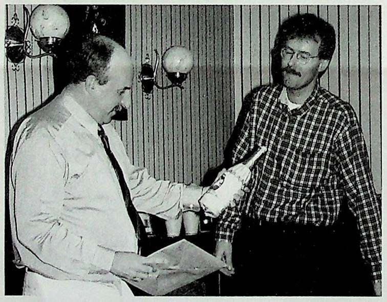 Oosterbeek, the Schoonoord restaurant, 7 October 200’1. Stuart Eastwood receives a bottle of Airborne beer from Eugene Wijnhoud as a ’thank you’ for his interesting lecture on the history of the 1st Battalion The Border Regiment.