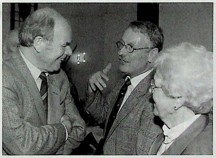 9 May 2003. Berry de Reus and Els Catersels are congratulated by Renkum aiderman Chris van Waveren (on the left) on the occasion of the reception held in the Airborne Museum to celebrate their 25 years work at the museum. (Photo: Robert Voskuil)