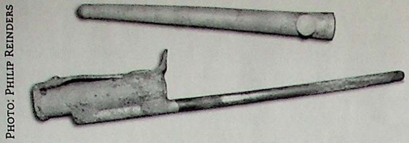 Philip Reinders of the ‘Arnhem Battle Research Group’, who regularly combs the former battlefields around Arnhem with a metal detector, recently unearthed a very unusual Stengun bayonet near Ginkel Heath. It is the type that is officially known as ‘Bayonet Machine Carbine Mark I’ which only fits the Stengun Mark II, the one with the open, metal butt. In 1944 the British airborne forces were mainly equipped with the more modem Sten Mark V, which had a wooden butt and two wooden handgrips. But apparently some troops were still using the old Mark II. The bayonet was found near Ginkel Heath at the spot where C Company of the 7th Battalion, The King’s Own Scottish Borderers was positioned on 17 and 18 September 1944