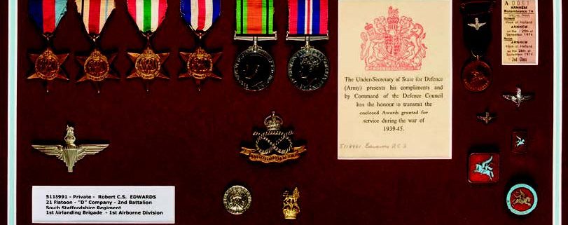An ‘Arnhem’ group of six attributed to Private R.S. Edwards, 21 Platoon, 2nd Bn, South Staffordshire Regiment 1939-1945 Star, Africa Star, Italy Star, France & Germany Star, Defence and War Medals, extremely fine, presented in a frame with medal enclosure inscribed to the recipient, Parachute regiment badge with king’s crown, South Staffordshire Regiment cap badge, various related insignia and Airborne march medal and enamelled badges, framed and glazed, frame size 31.5 x 55cm, together with a pocket diary kept by Edwards for 1944, inscribed in pencil with entries on the repeated cancellation of Operation Market Garden, for example 15 September ‘Operations!!! flew to Arnhem Holland shot up on landing platoon commander wounded, two killed’, 20 September ‘mortars all around us like rain, wounded in right leg’, 21 September ‘lose bridges, retreat from Arnhem to Oosterbeek, very heavy losses have only pistol 8 four rounds left, house to house fighting’, 24 September ‘am taken prisoner, feel very humiliated, a glorious scrap and it had to end like this, try to get away but am nearly shot’, also included copied photographs of the recipient and family, two books, A Bridge too Far by Cornelius Ryan which features Edwards on p337, 338, 351, 443, 444, By Land, Sea and Air, Illustrated History of the 2nd Battalion, The South Staffordshire Regiment 1940 1945 by Alexander Junier and Bart Smulders with Jaap Korsloot, Edwards is mentioned numerous times in this book with illustrations 5118991 Private Robert C.S. Edwards was born in Birmingham in 1923, he served during WWII with 21 Platoon “D” Company, 2nd Battalion, South Staffordshire Regiment. On 10 October 1941 the 2nd Bn became part of the newly formed 1st Airlanding Brigade as part of the 1st Airborne Division. After completing training the embarked for North Africa and became part of the Attacking Force, under American control that planned to land on Sicily on 6 July 1943. The glider towing aircraft piloted by the Americans had no experience of night flying, so the Force became widespread and as they neared Sicily the enemy opened fire, which unnerved the Americans who released the gliders prematurely over the sea. Private Edwards glider ditched into the sea and he was rescued some hours later. Of the 48 Officers and 768 men of the 2nd Bn who set out in gliders only 19 Officers and 269 returned.