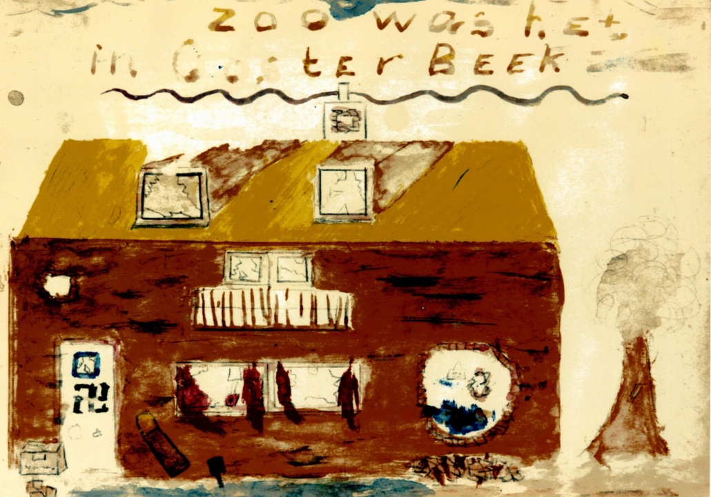 Met Kerstmis kregen alle kinderen cadeaus uit Engeland! Ik kreeg een prachtige doos met plakkaatverf en penselen. Tijdens die vakantie heb ik een “schilderij” gemaakt van een denkbeeldig huis. En zette erboven: “Zoo was het in Oosterbeek”.